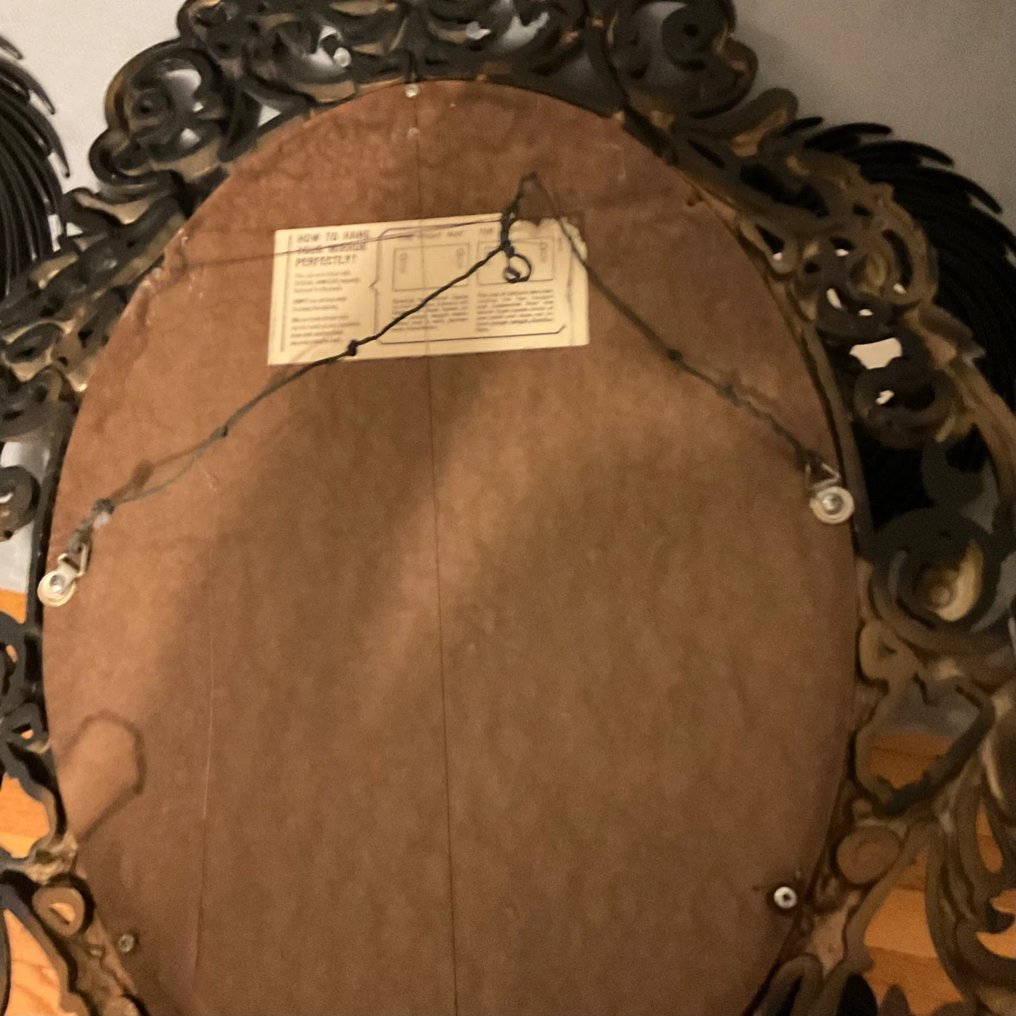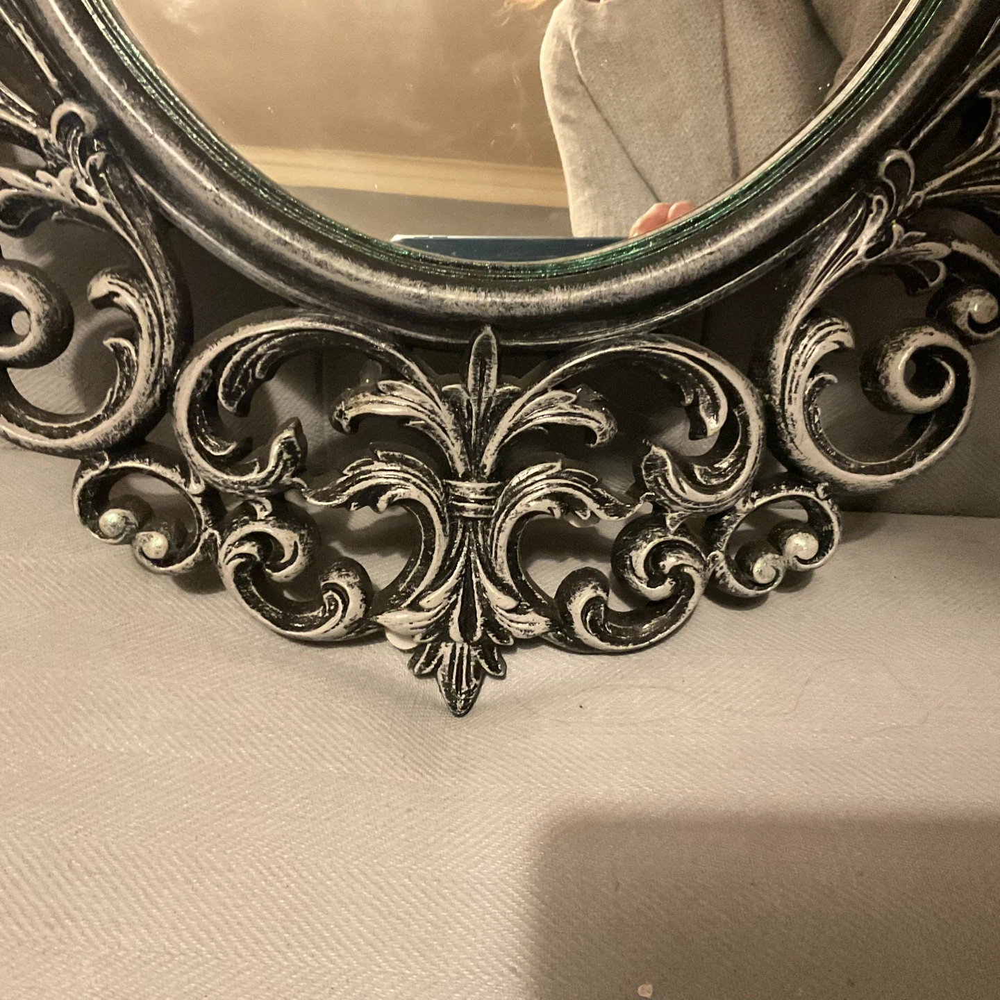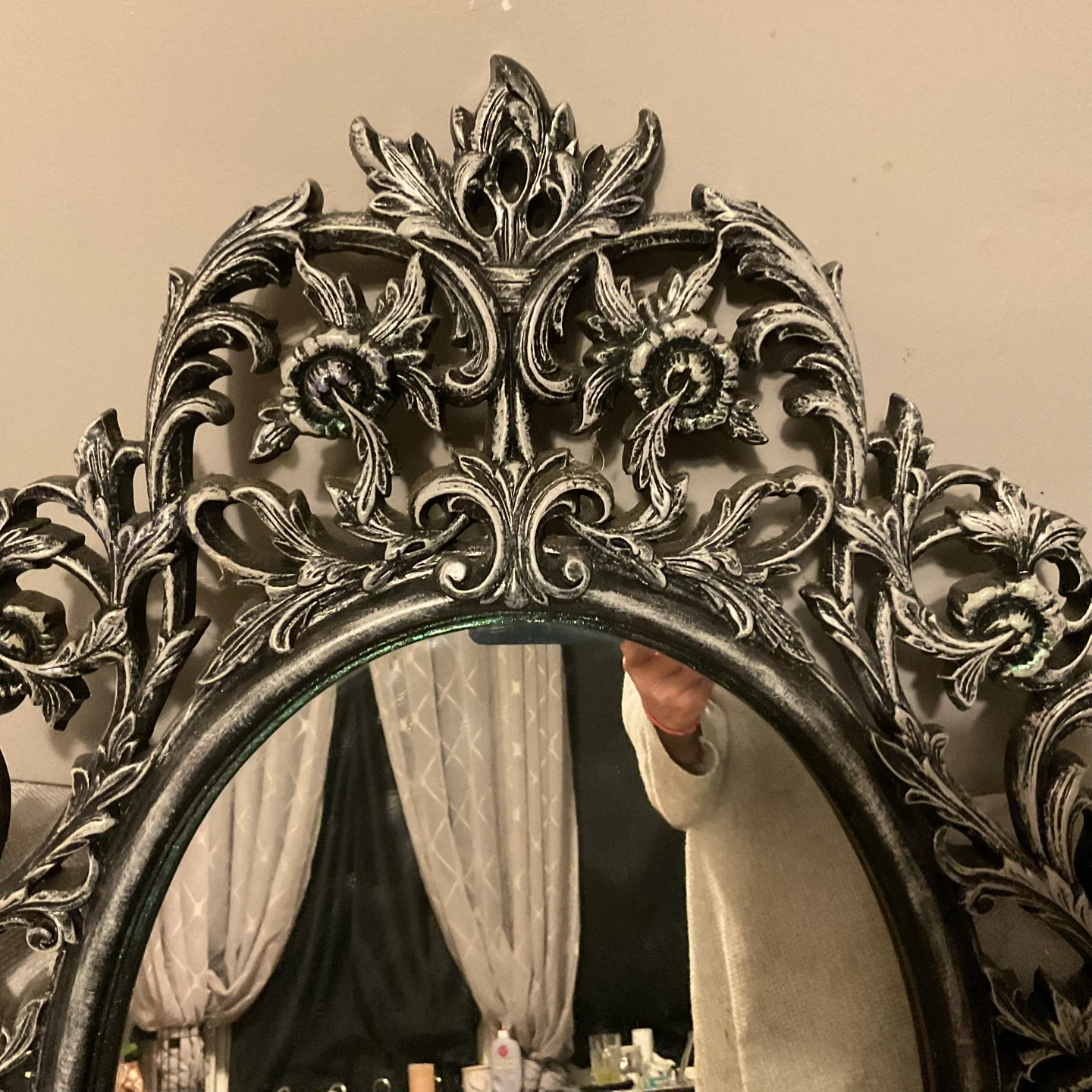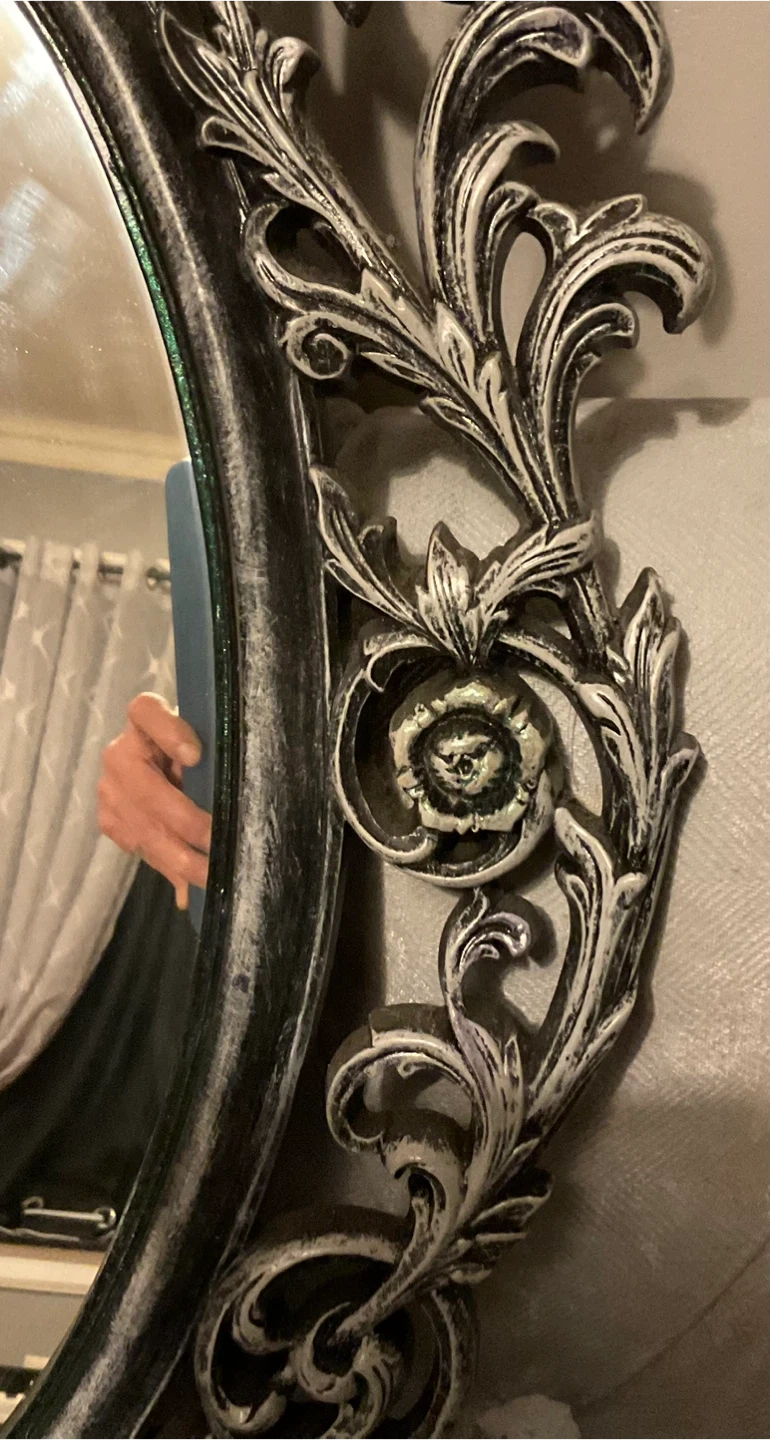 113Selling an vintage gothic ornate oval wall mirror. It has a beautiful black and silver decorative frame with floral accents. Perfect for adding a touch of elegance or goth to any room!