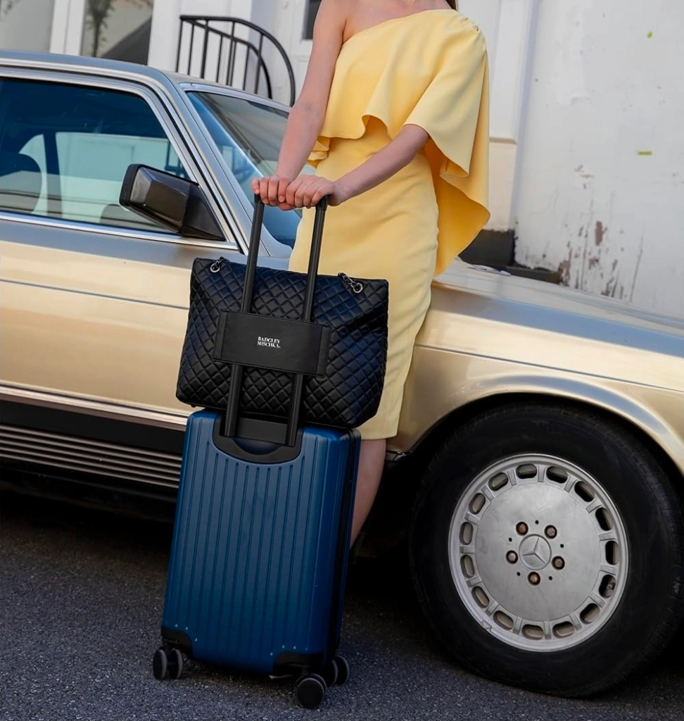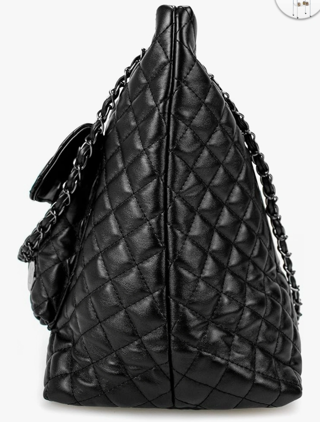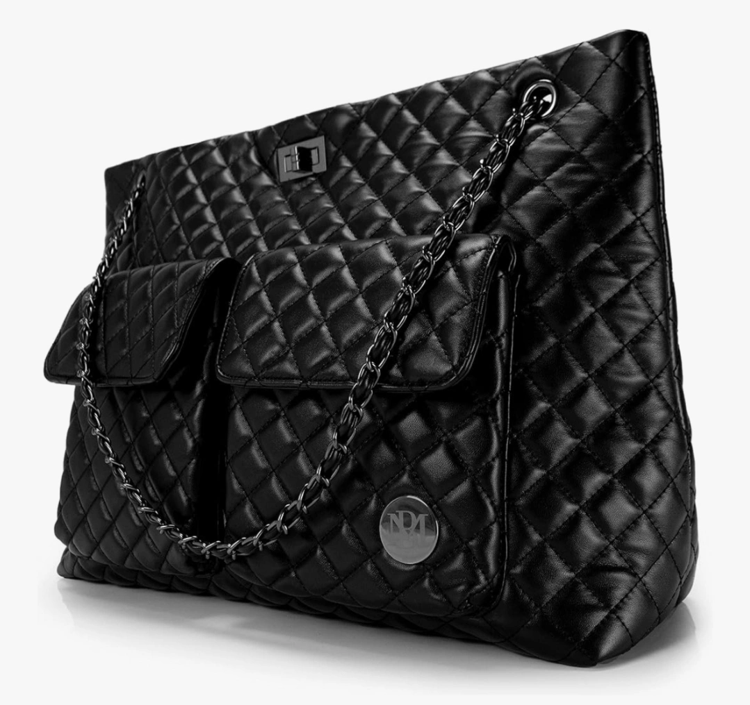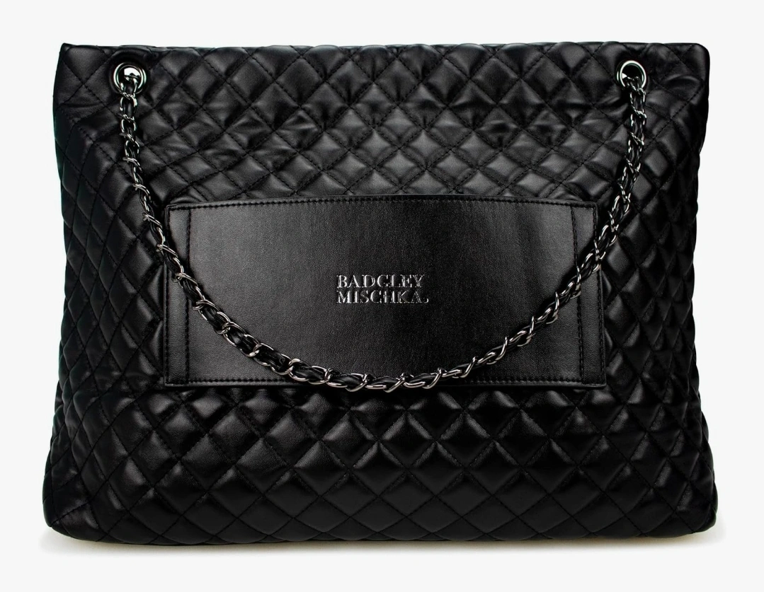 81This is a Badgley Mischka tote bag in black. It features a quilted design and chain straps. The interior has a red patterned lining. It's a stylish and functional bag!