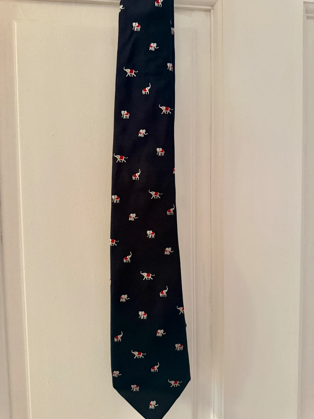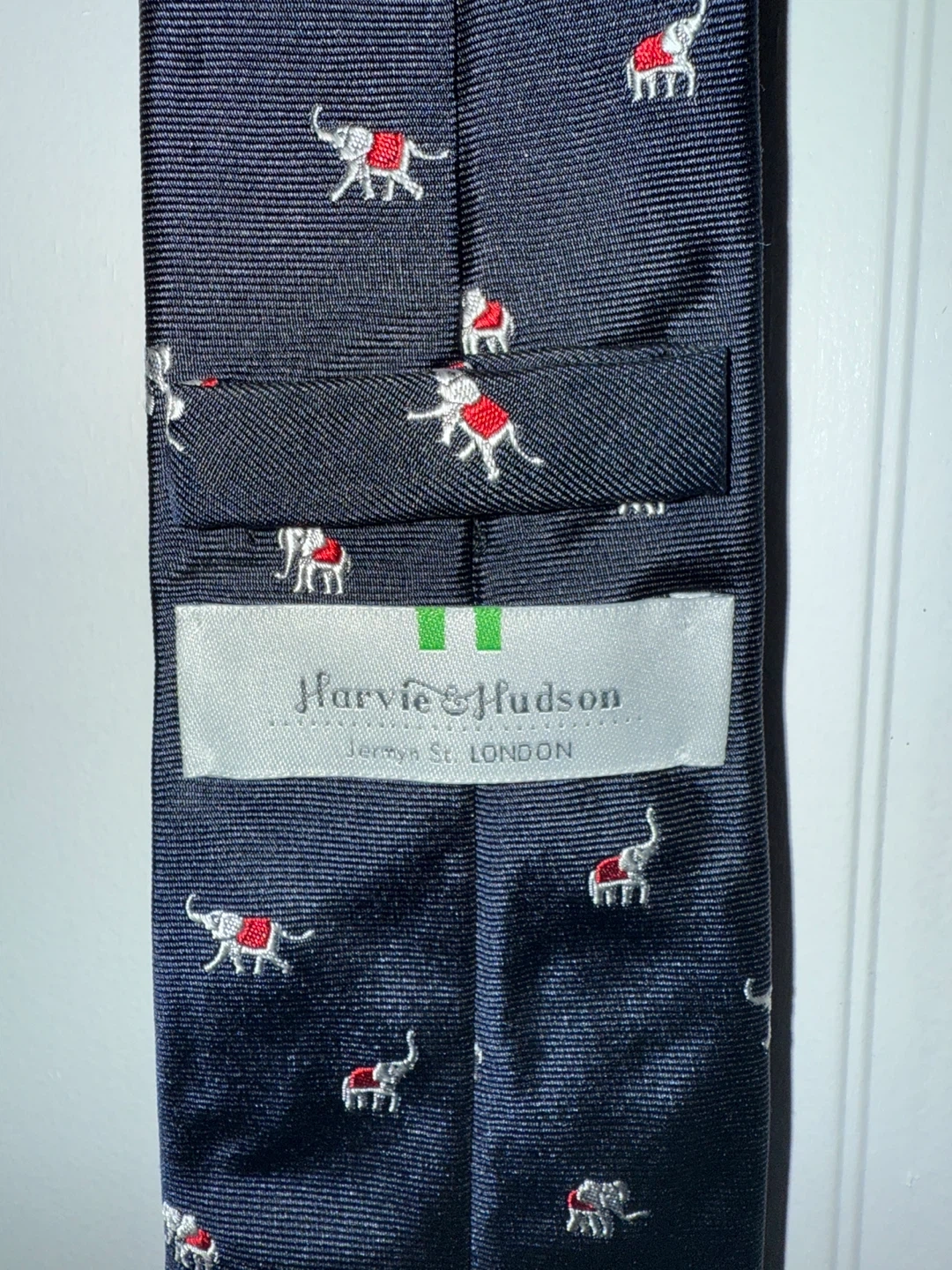 211This is a Harvie & Hudson tie with a fun elephant print! It's in great condition and ready to add some personality to your wardrobe. The tie features a navy blue background with small, repeating elephant motifs in white and red. Perfect for adding a touch of whimsy to your outfit