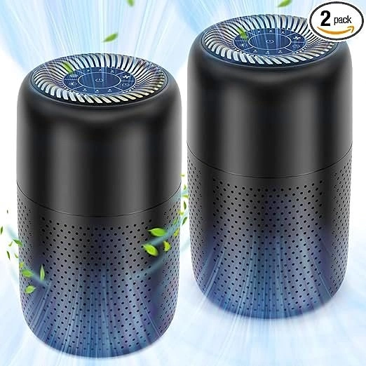 10New in box. Includes two H13 True HEPA air purifiers, ideal for pet owners, parents with newborns, and improving air quality in small to medium rooms. Operates at just 20dB and includes a night light feature. Low power consumption (5W on high speed) and offers 3 fan speeds and 3 timer options (2H/4H/8H). Lightweight (2.2 lbs), compact design (6.3”x6.3”x10.2”), with a simple filter replacement process. Filter needs replacement every 3-6 months. ETL, CE, FCC, RoHS, and CARB certified. Package Includes: 2 Vhoiu KJ50 Air Purifiers, 2 HEPA filters, 2 power adapters, and 2 user manuals.