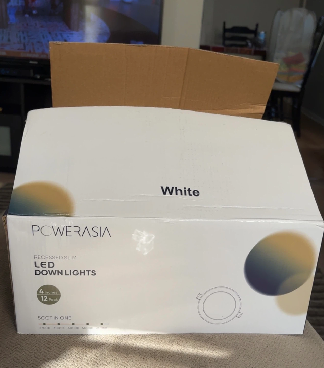 Selling a 12-pack of POWERASIA 4-inch ultra-thin LED recessed ceiling lights. These lights are 5CCT dimmable and operate at 2700K/3000K/4000K/5000K/6000K, 9W 700lm Can Killer Downlight-ETL and Energy Star Certified. The original price was $159.99. Box included
