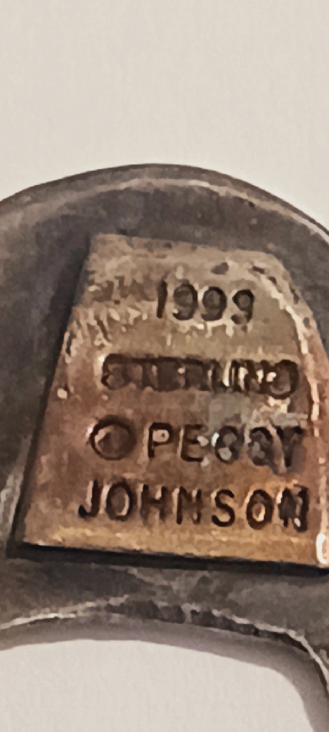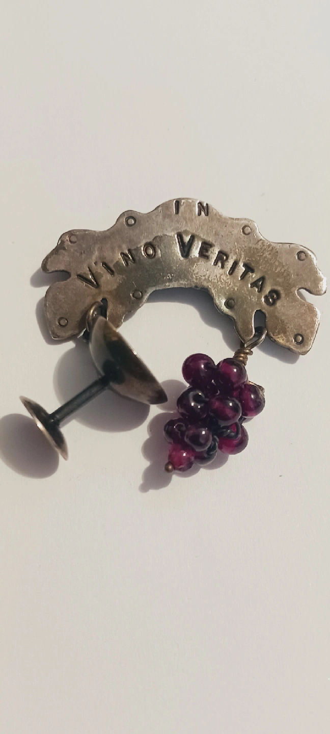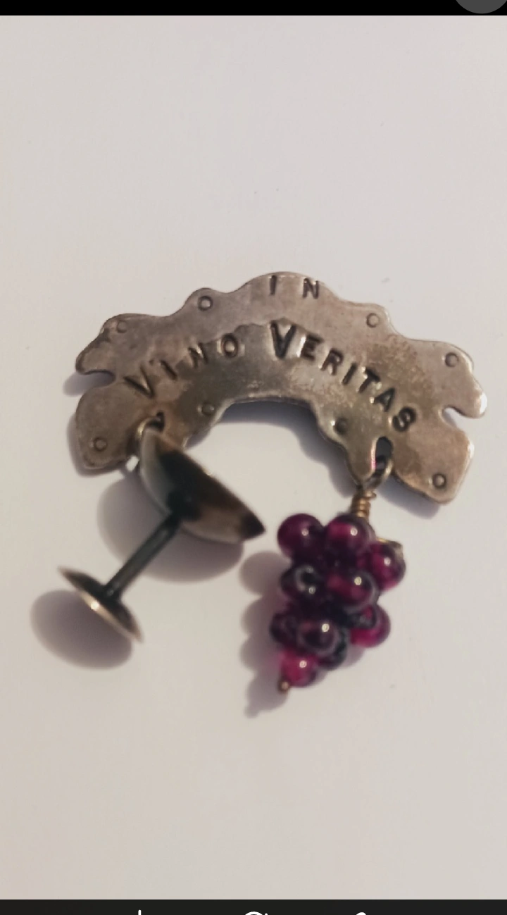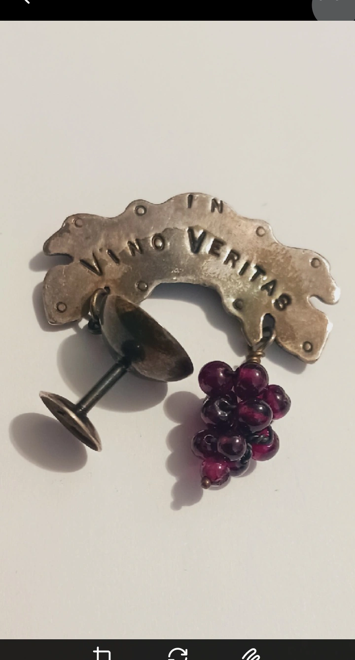 1000+This is a vintage 1993. Peggy Johnson sterling silver signed brooch/ pin. It features the phrase 'In Vino Veritas' with a wine glass and a cluster of grapes. The pin is marked '1993. Sterling © Peggy Johnson'. Excellent condition. 1.5"×1.5". ALL MY PRICES ARE NEGOTIABLE !!!