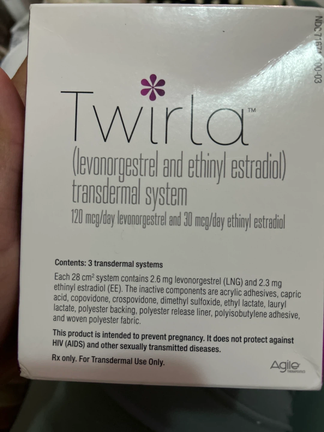 101Selling a Twirla (levonorgestrel and ethinyl estradiol) transdermal system. This product is intended to prevent pregnancy. Please note that it does not protect against HIV (AIDS) and other sexually transmitted diseases. Expiration dates: October 18, 2026 and September 27, 2026 $20 each box