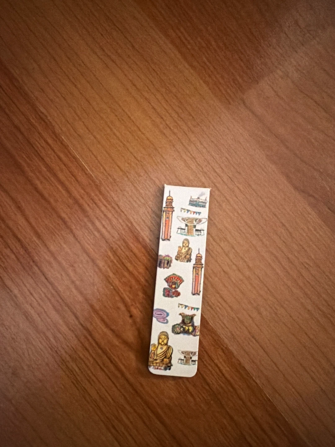 Here's a cute handmade bookmark featuring various cultural icons and landmarks! It's in great shape and ready to mark your spot in your favourite book