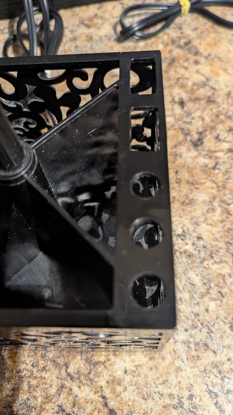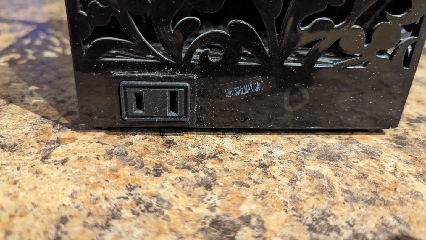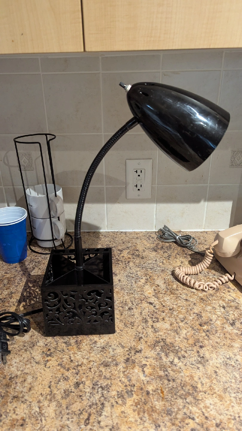 15Comes with brand new led light! 9 watts, equivalent to 60 watts This is a black desk lamp with a decorative, ornate design. The base also functions as an organizer with divided sections and holes for pens or other small items. It plugs into a standard outlet. Also there is an AC outlet, for charging small devices or electric devices.