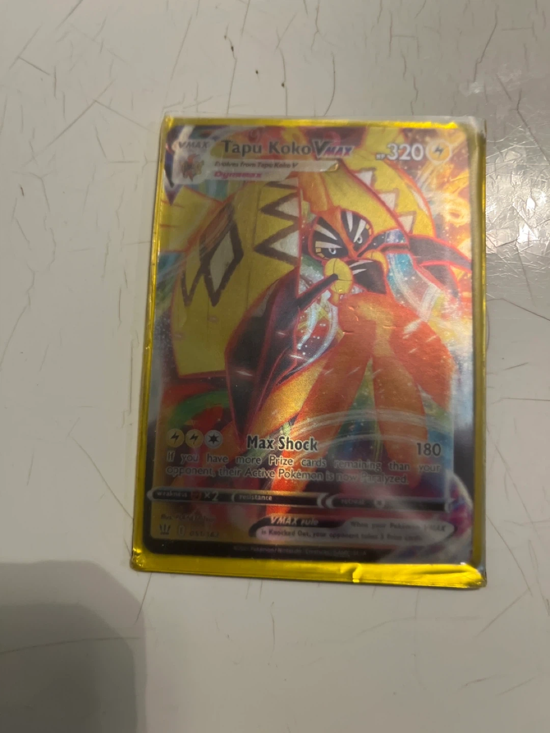 Selling a Tapu Koko VMAX Pokemon card. It evolves from Tapu Koko V and has a Max Shock attack that does 180 damage. If you have more Prize cards remaining than your opponent, their Active Pokémon is now Paralyzed