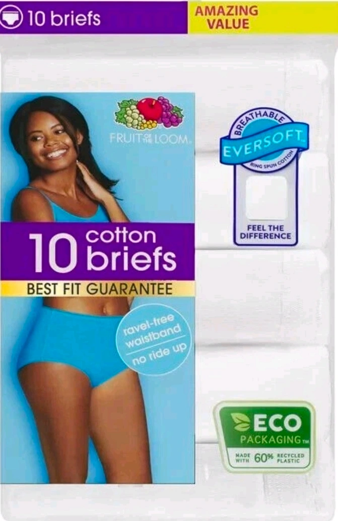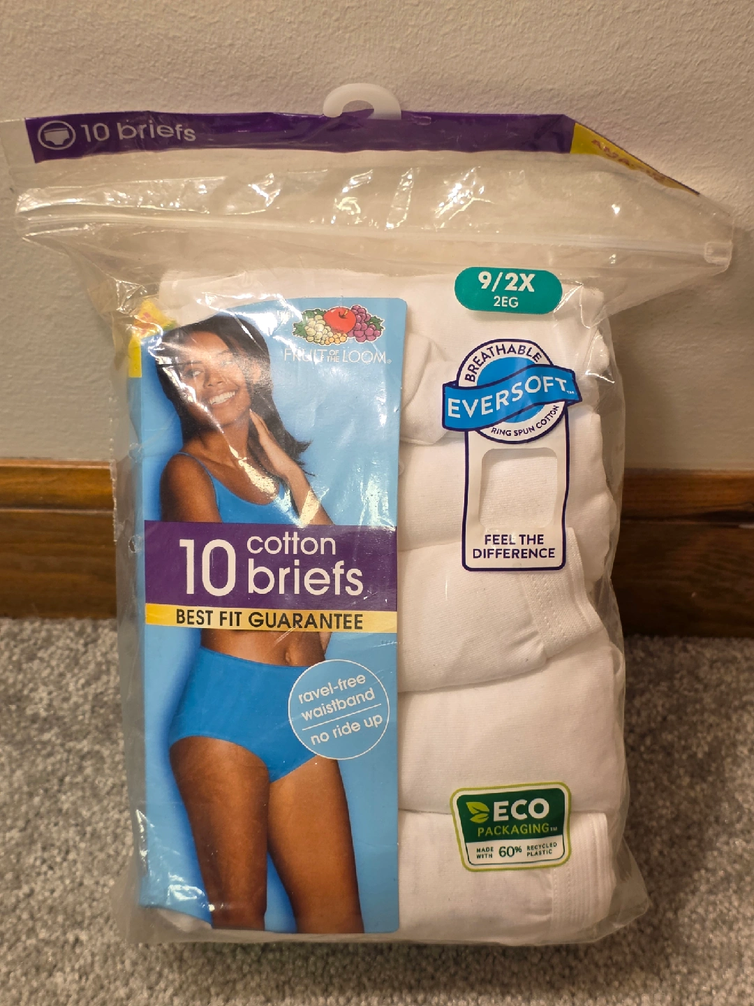20Selling a new pack of Fruit of the Loom women's cotton briefs, size 9/2X. These briefs feature a breathable Eversoft ring spun cotton and a ravel-free waistband that won't ride up. The packaging is made with 60% recycled plastic Pick up in Naperville near naper blvd and 87th street or near downtown Naperville off of Chicago and Charles