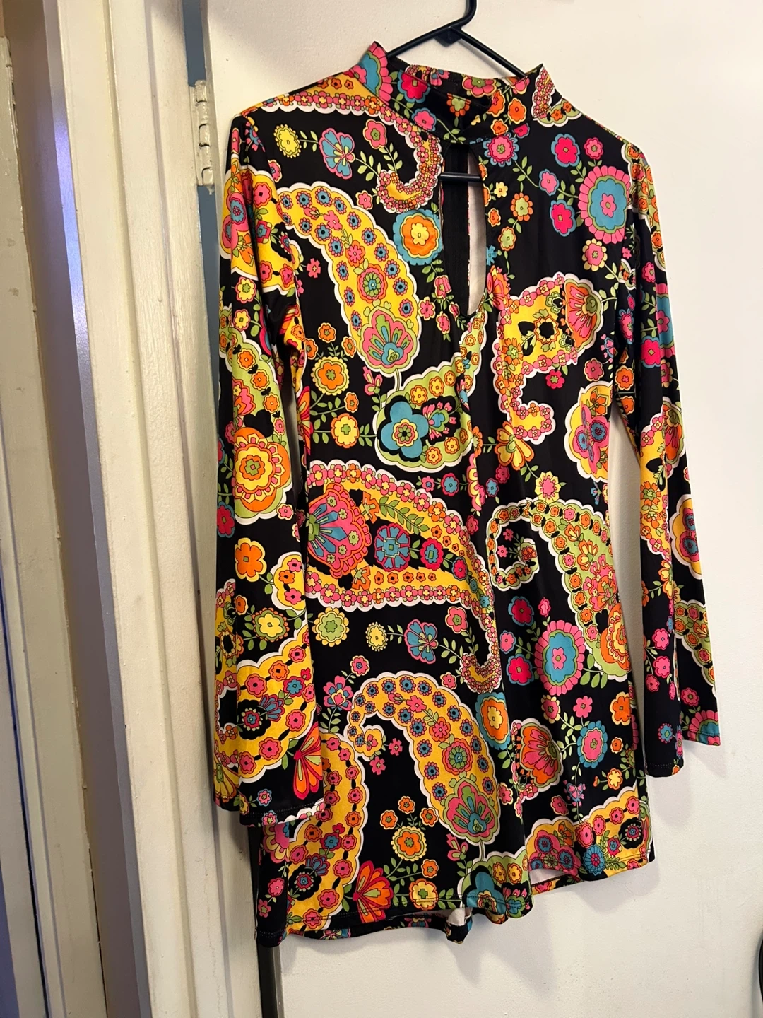 This is a groovy vintage mini dress with a fun floral print. It features a high neckline and long sleeves. The dress has a vibrant and colorful pattern, perfect for adding a retro touch to your wardrobe! I wore this as a Halloween costume a few years ago - I paired it with thigh high black