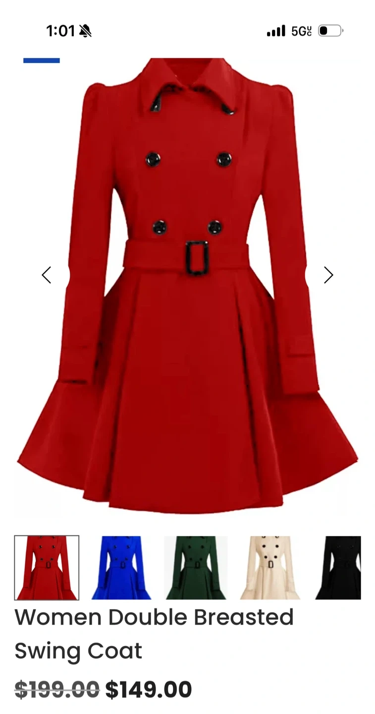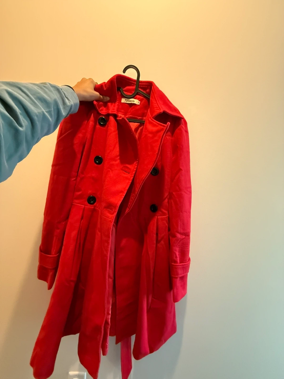 21Selling a stylish women's double-breasted swing coat in a vibrant red color. It features a classic design with a belted waist and a flattering silhouette