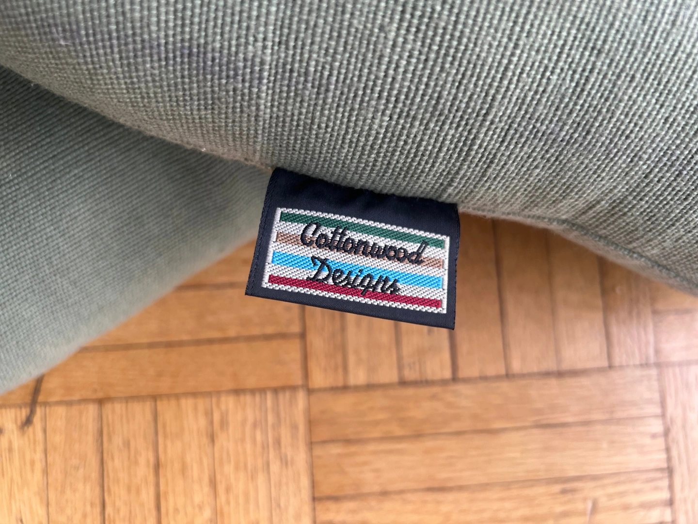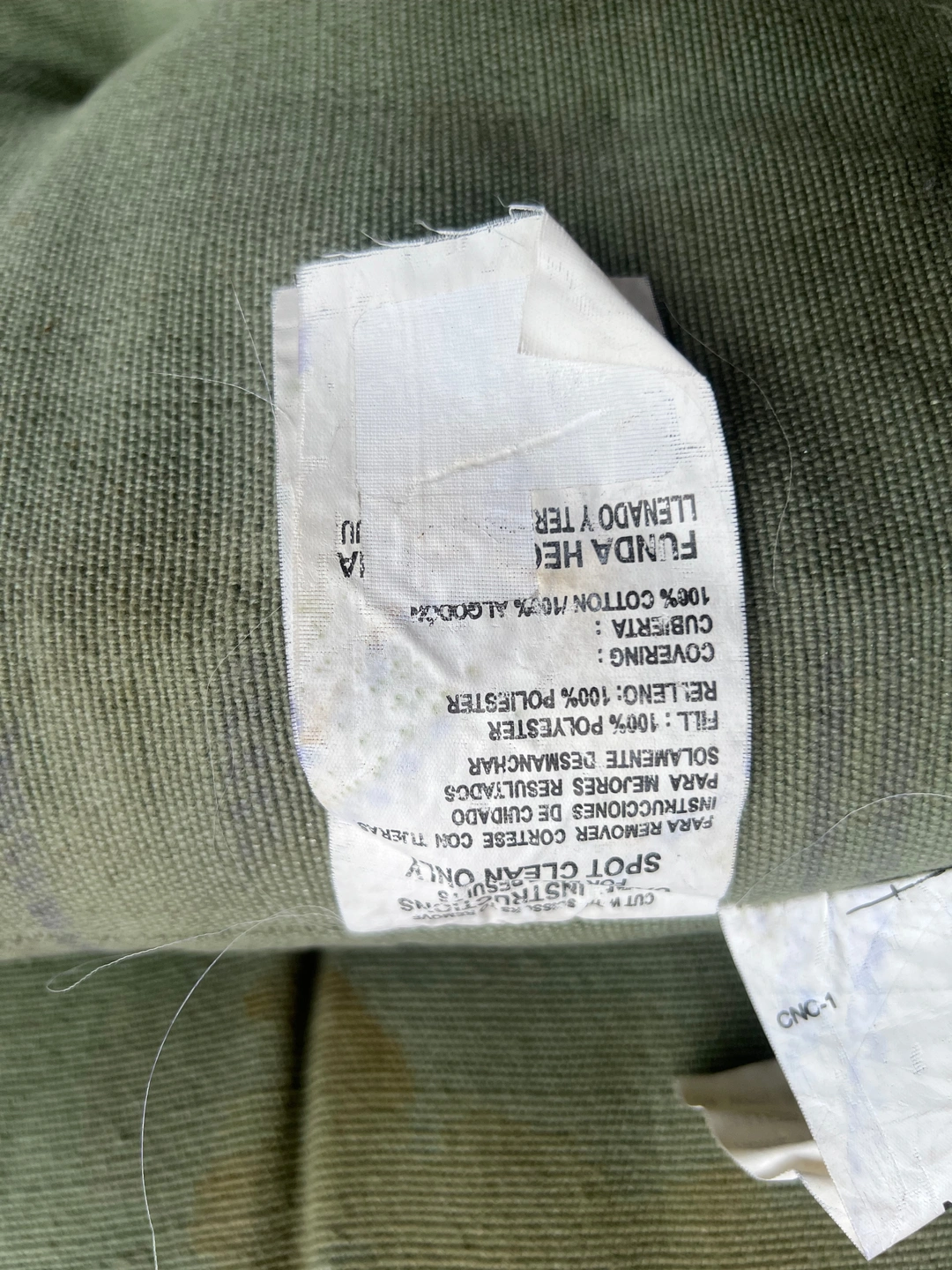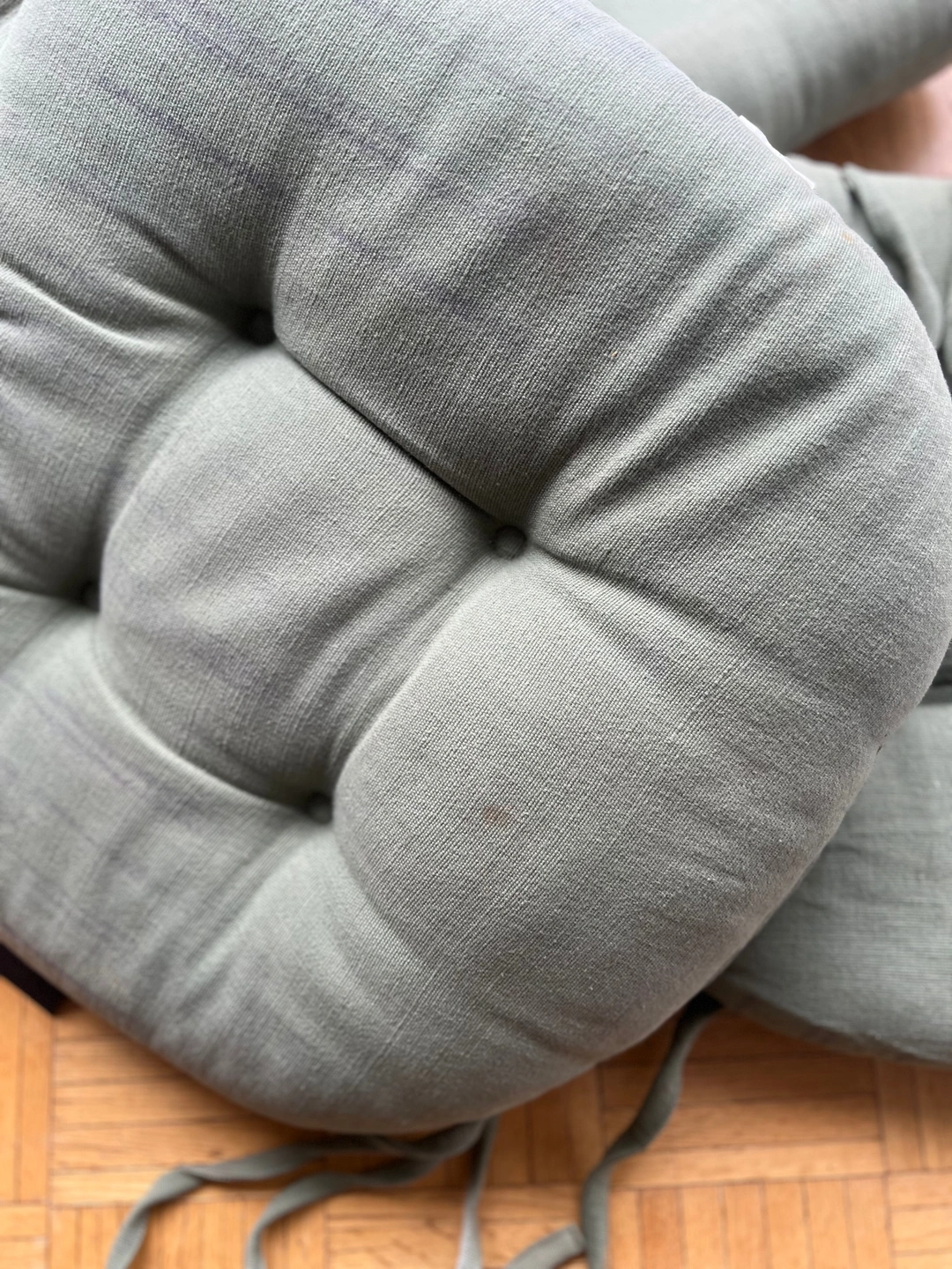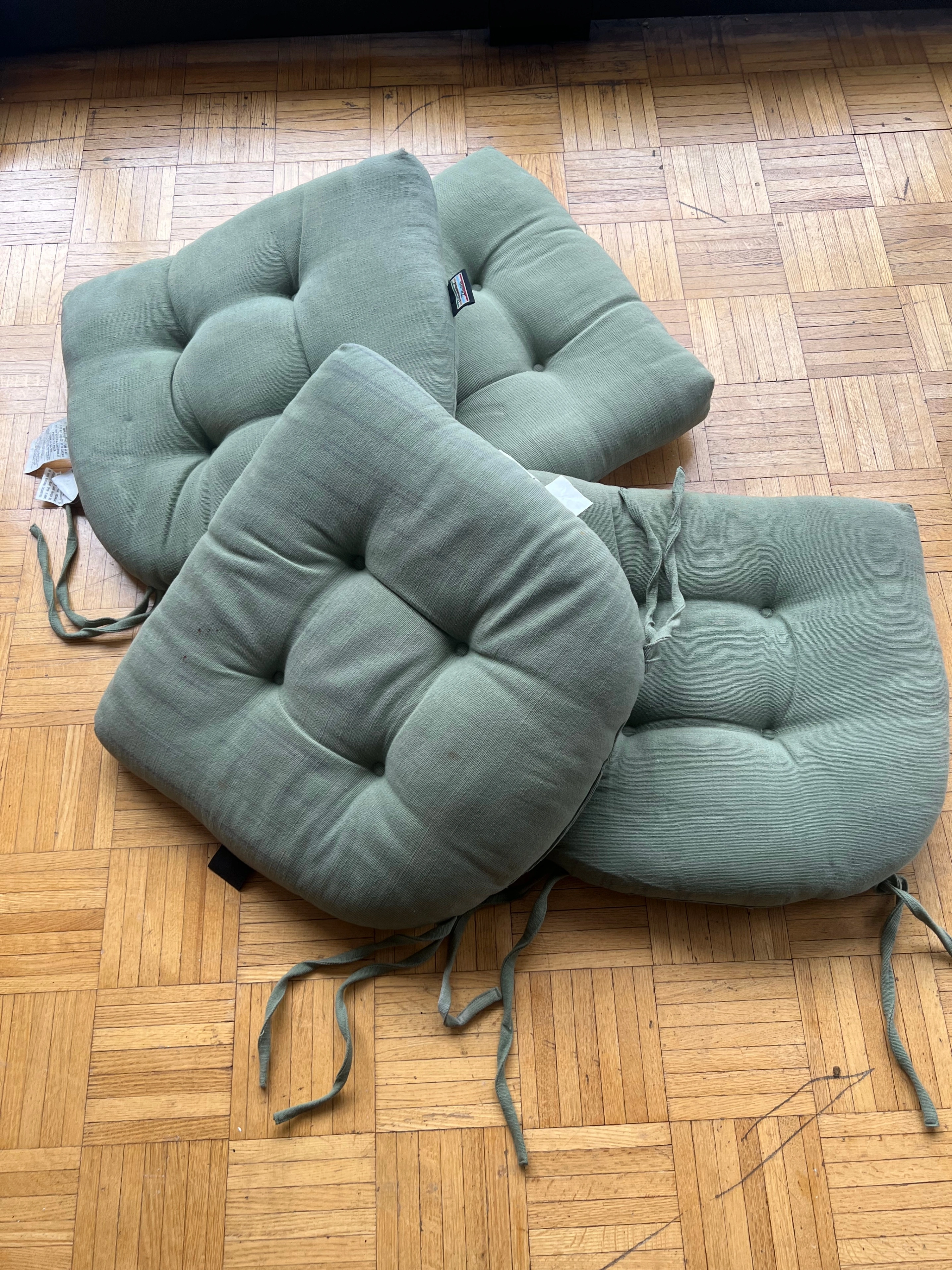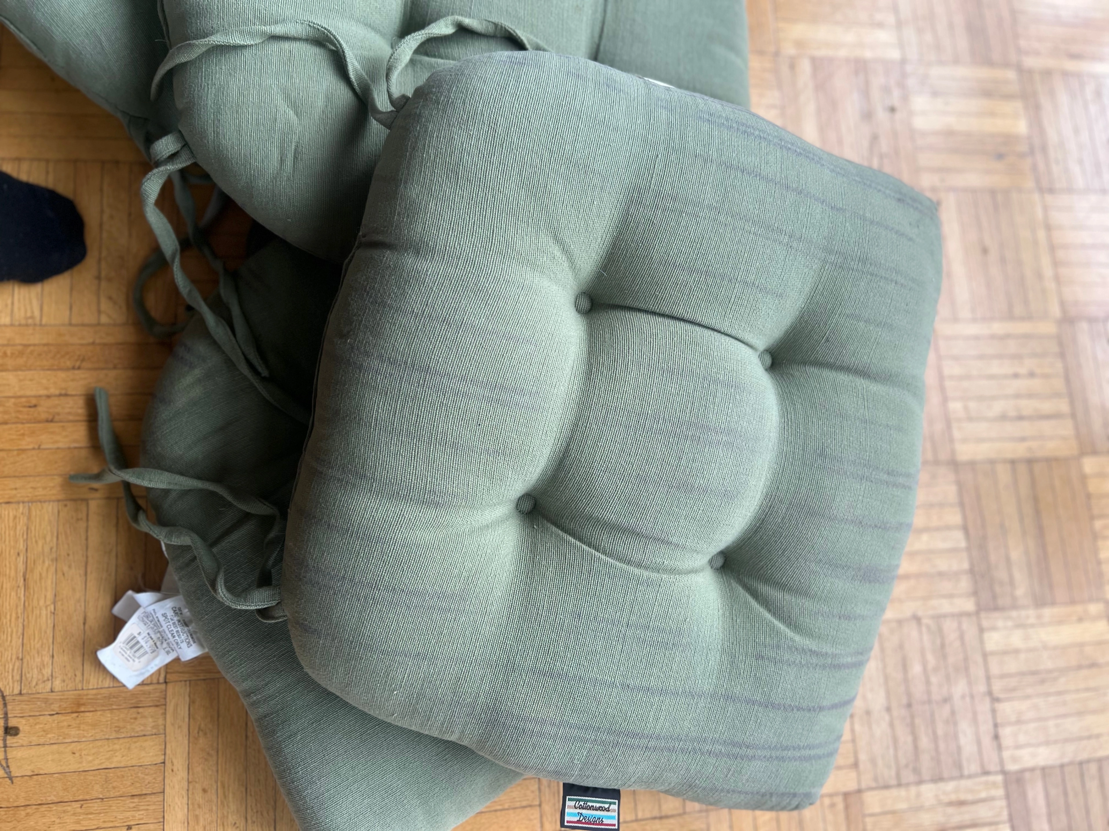 83Pick up at Upper East 93rd and 2nd Building lobby Condition: Very Good – lightly used with very minor stains (barely noticeable). Quantity: 4 cushions Color: Sage green / muted olive tone Brand: Cottonwood Design by Jordan Manufacturing (Made in USA) 21" x 20" x 2-2.5" Material: Weather-resistant fabric with tie-backs
