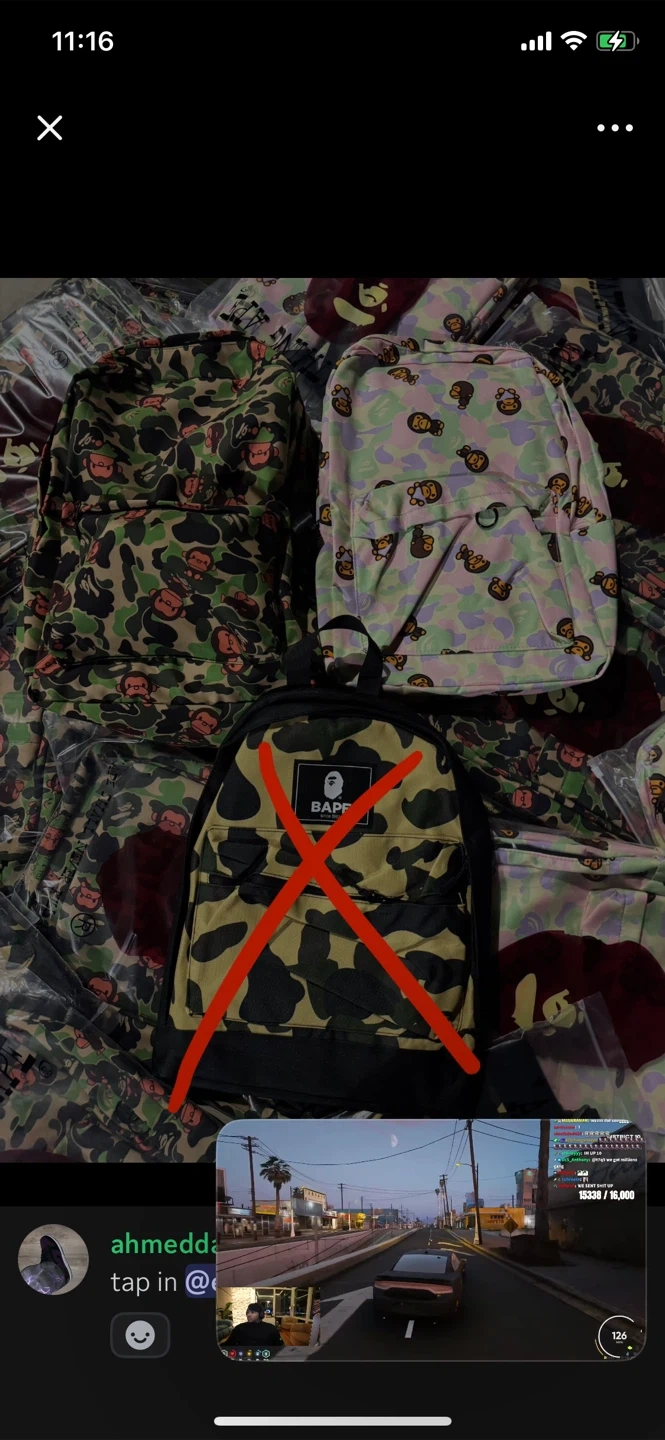 87Here are some BAPE backpacks in a camo pattern. One is green camo and the other is a pastel purple camo with the BAPE monkey logo all over it. Great for school or travel!
