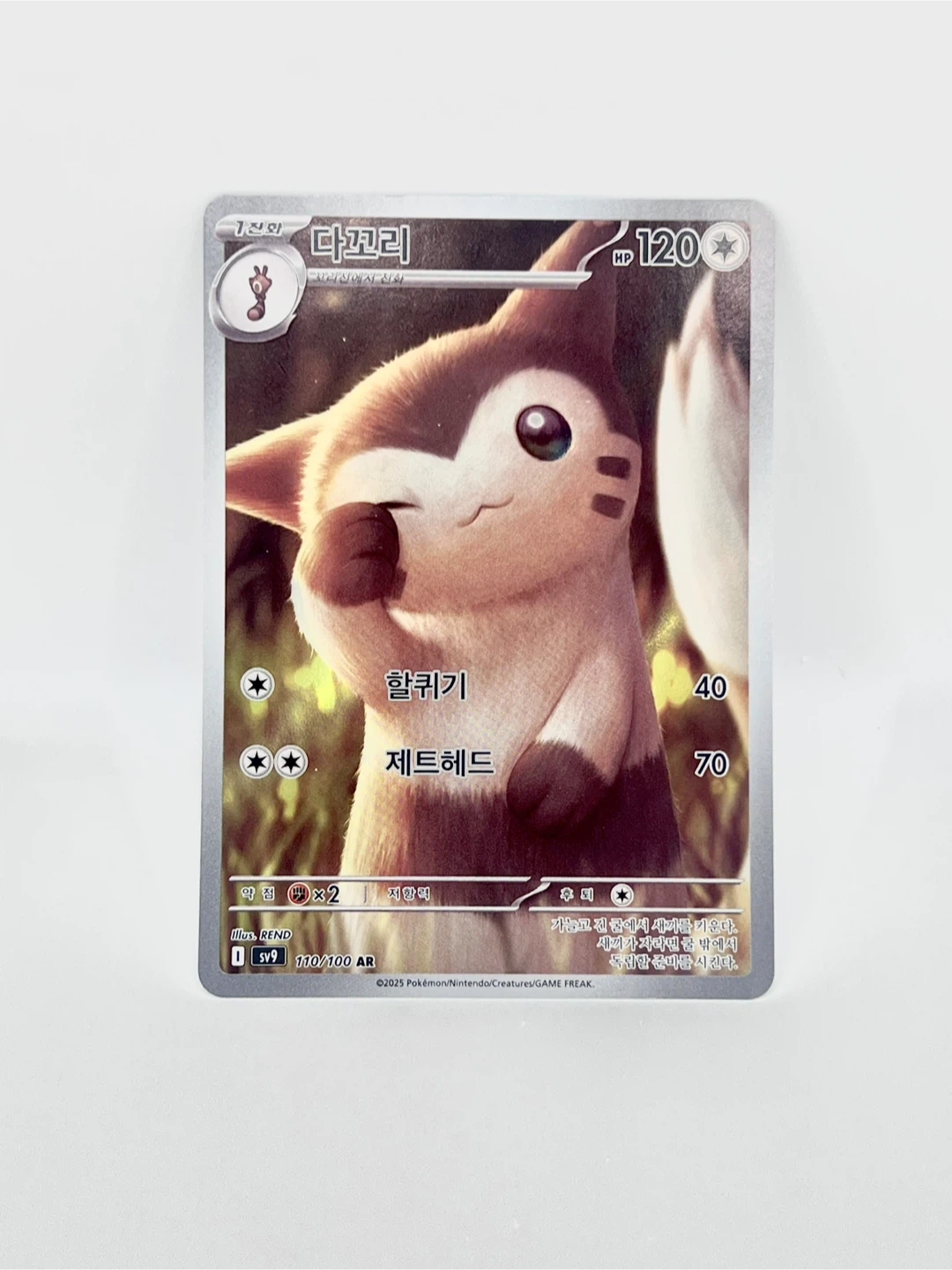 60Selling a Pokemon card featuring Fidough (다꼬리). It's card number 110/100 AR from the SV9 set. Artwork by REND. ©2025 Pokémon/Nintendo/Creatures/GAME FREAK