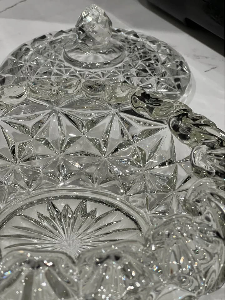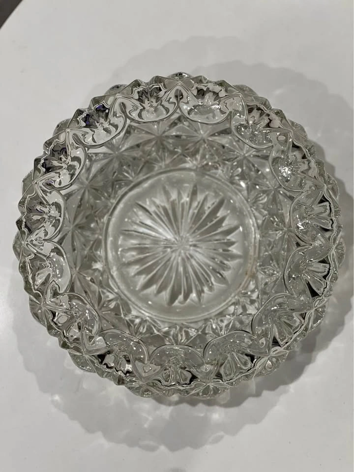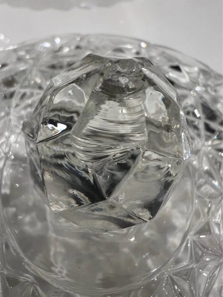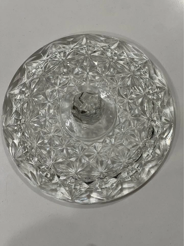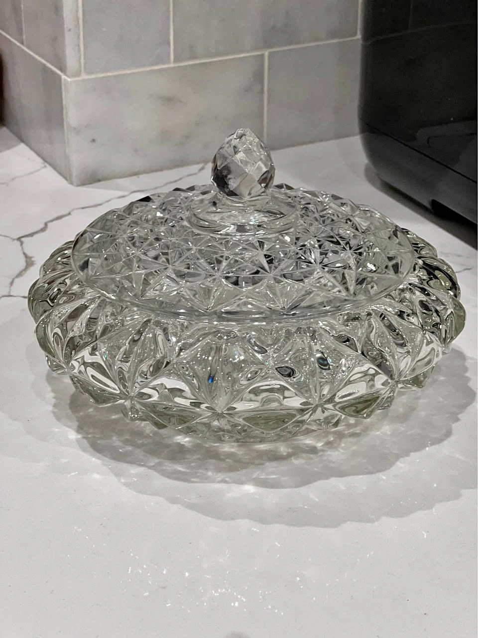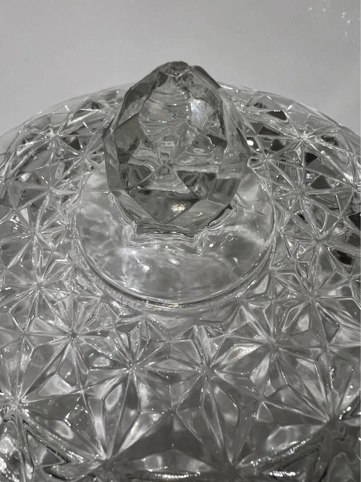 117Vintage Depression Glass Large Lidded Candy Dish Diamond & Sunburst with a chip on the lid handle.