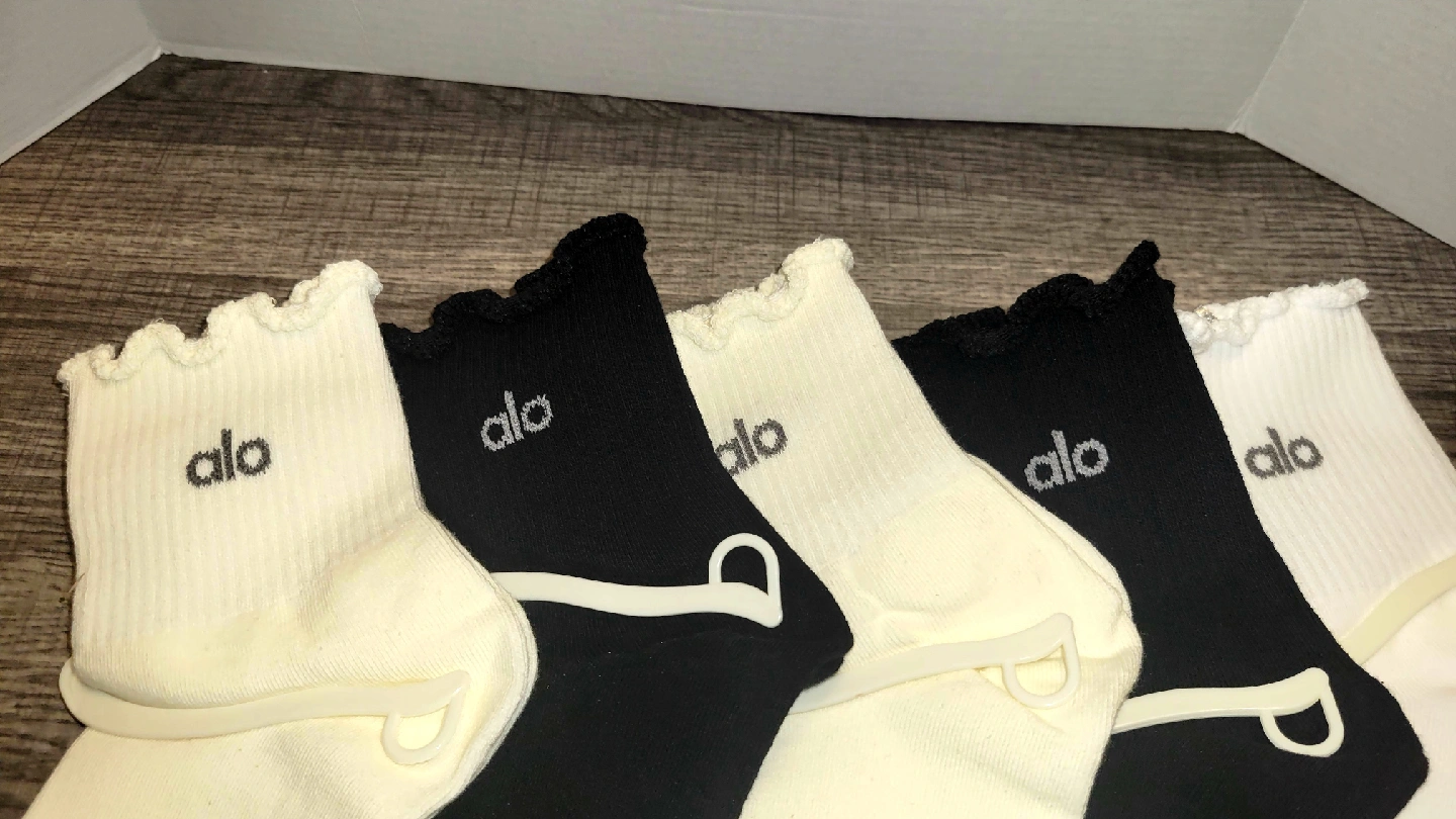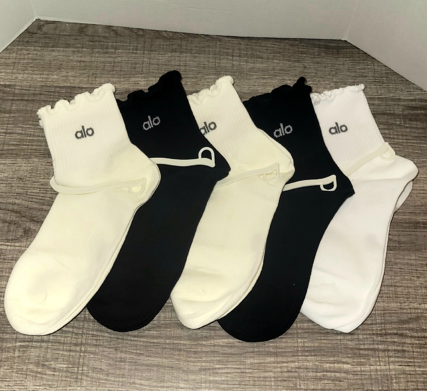 511Cute Alo Yoga ruffle socks in a mix of black and white! Perfect for adding a little flair to your workout or everyday wear