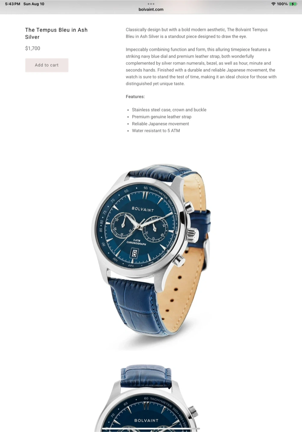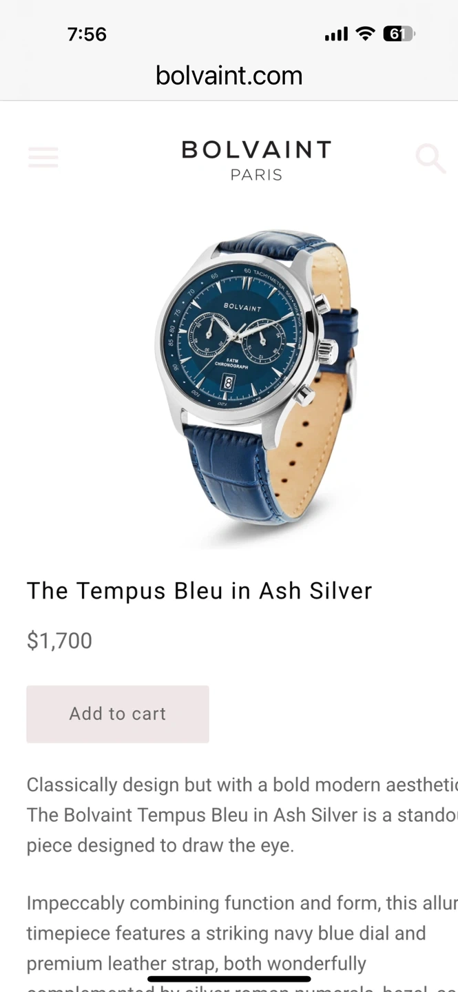 76Selling a Bolvaint Tempus Bleu in Ash Silver watch! It features a striking navy blue dial and premium leather strap. The watch has a stainless steel case, crown, and buckle, with a reliable Japanese movement. It's also water resistant to 5 ATM!