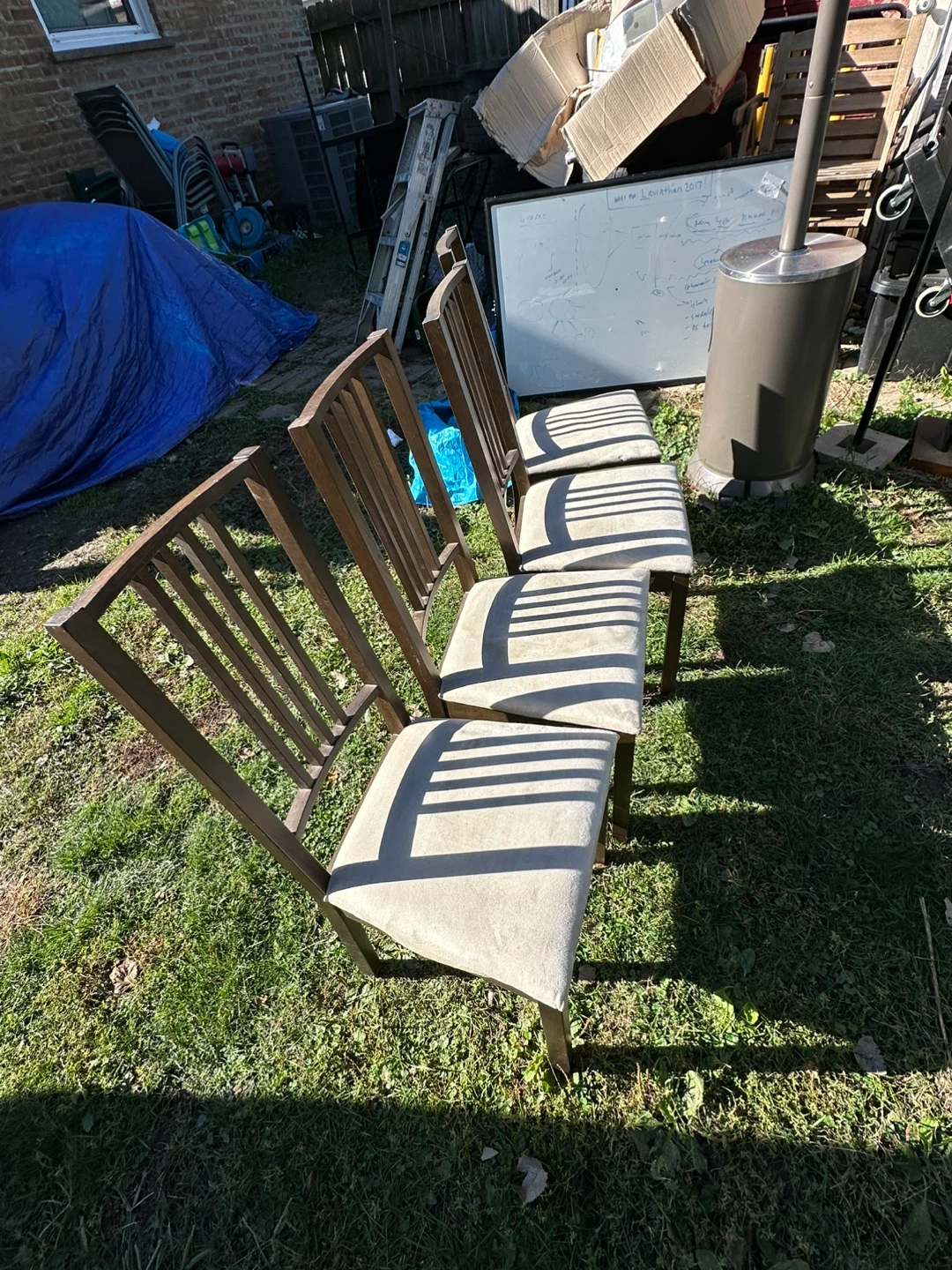Selling a set of 4 dining chairs! They are a light brown color with a beige seat. The seat measures approximately 16 inches by 18 inches. Great for adding extra seating to your dining room or kitchen