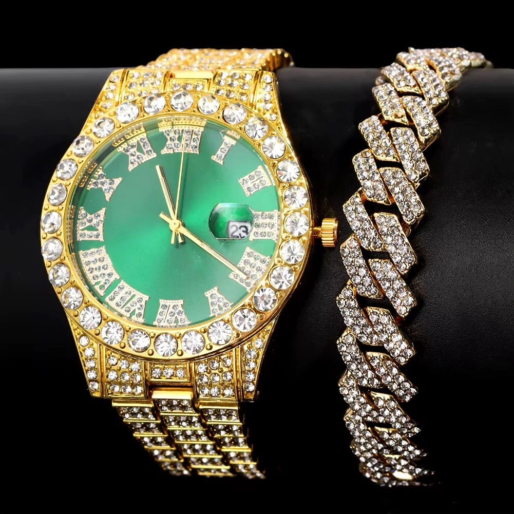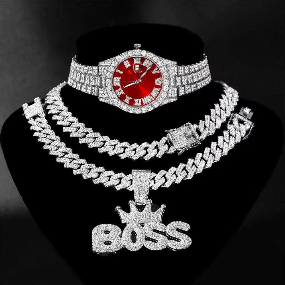10Gold watch with red face and two gold necklaces with 'BOSS' pendant. Let me know if you're interested!
