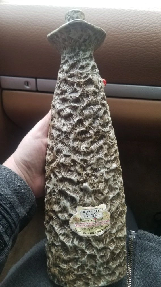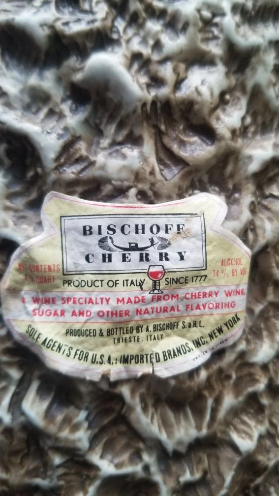 15Nice handpainted wine bottle by Italian painter Furlan. Never opened bottle of Cherry still full. Excellent for any collector. Era is the 1960's. Color: Beige