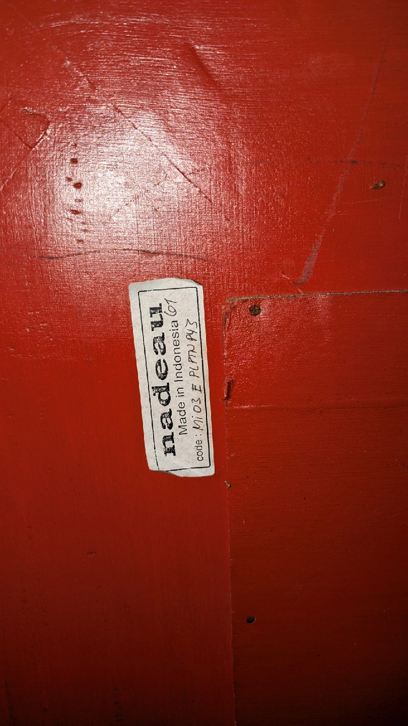 This is a large heavy mirror from Nadeau furniture company (furniture with a soul).It was imported from Indonesia and has a wire hanging back.