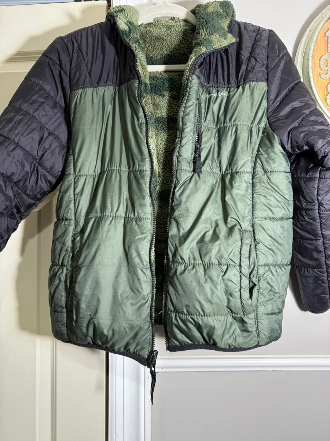 This is an Eddie Bauer kids reversible jacket in size L (14/16). One side is a camo sherpa fleece and the other is a green and black puffer jacket. The shell is 100% nylon, faux fur is 100% polyester, and fiberfill is 100% polyester