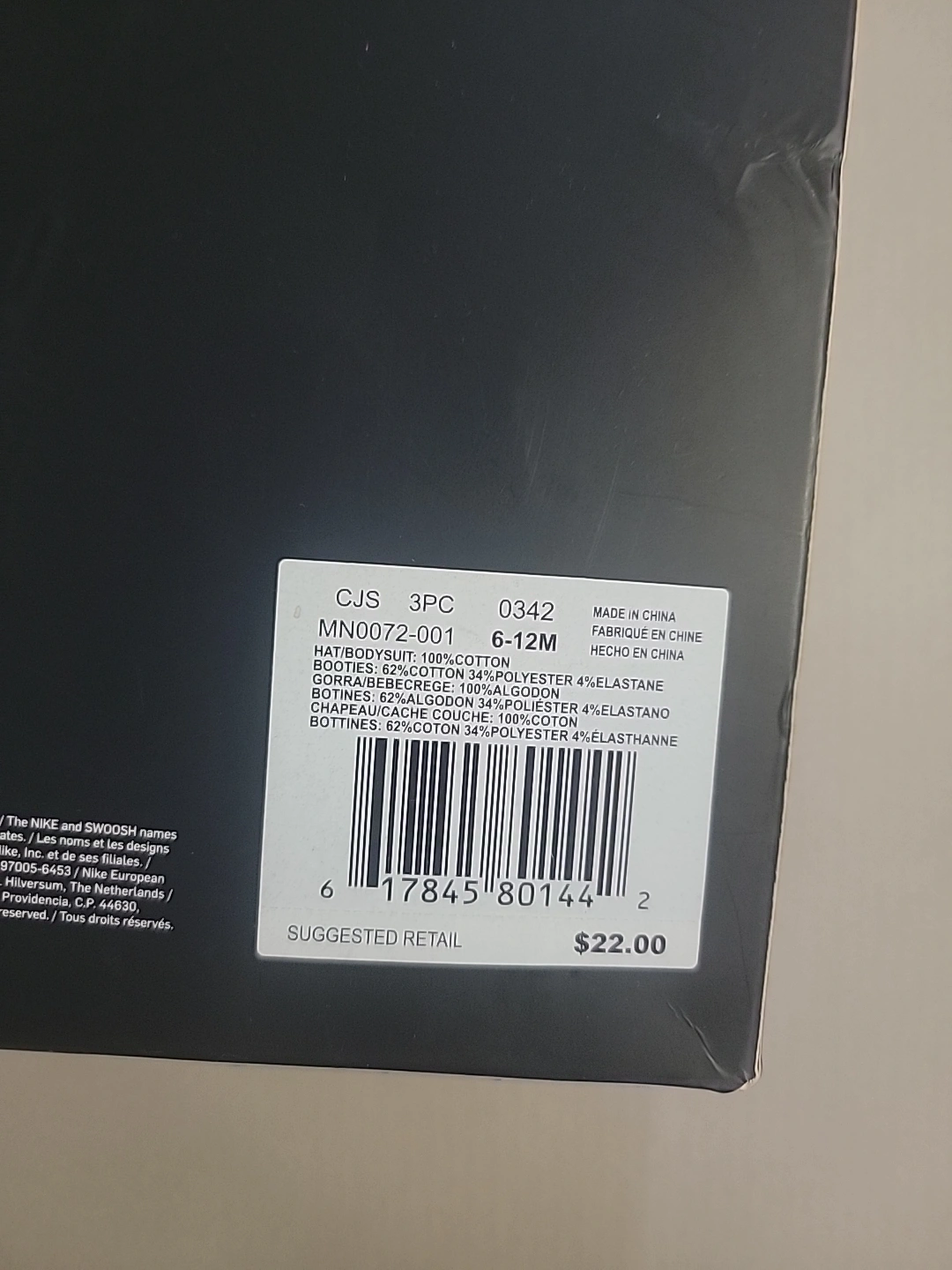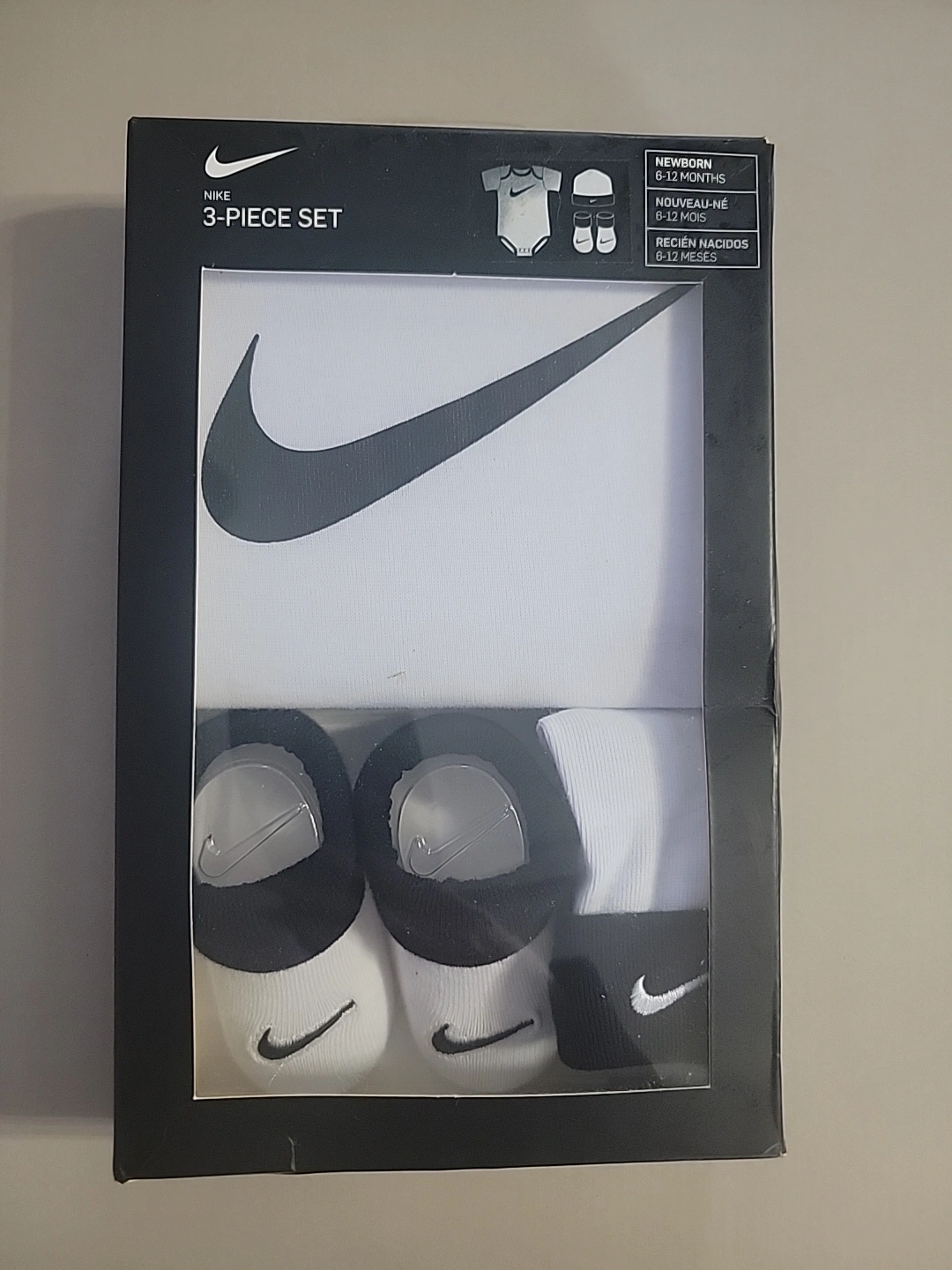 67Brand new Nike 3-piece set for babies aged 6-12 months! The set includes a hat/bodysuit made of 100% cotton, and booties made of 62% cotton, 34% polyester, and 4% elastane. Originally retailed for $22. Comes in the original box