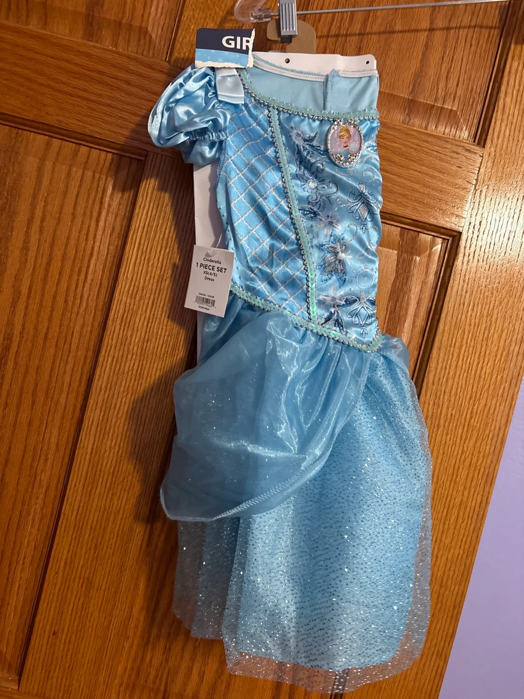 60Selling a cute Cinderella dress for your little princess! This is a 1-piece set in size XS (4/5). It's a beautiful light blue color. Perfect for dress-up or a costume party!