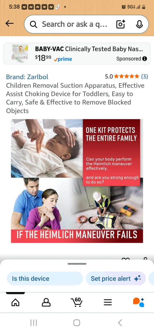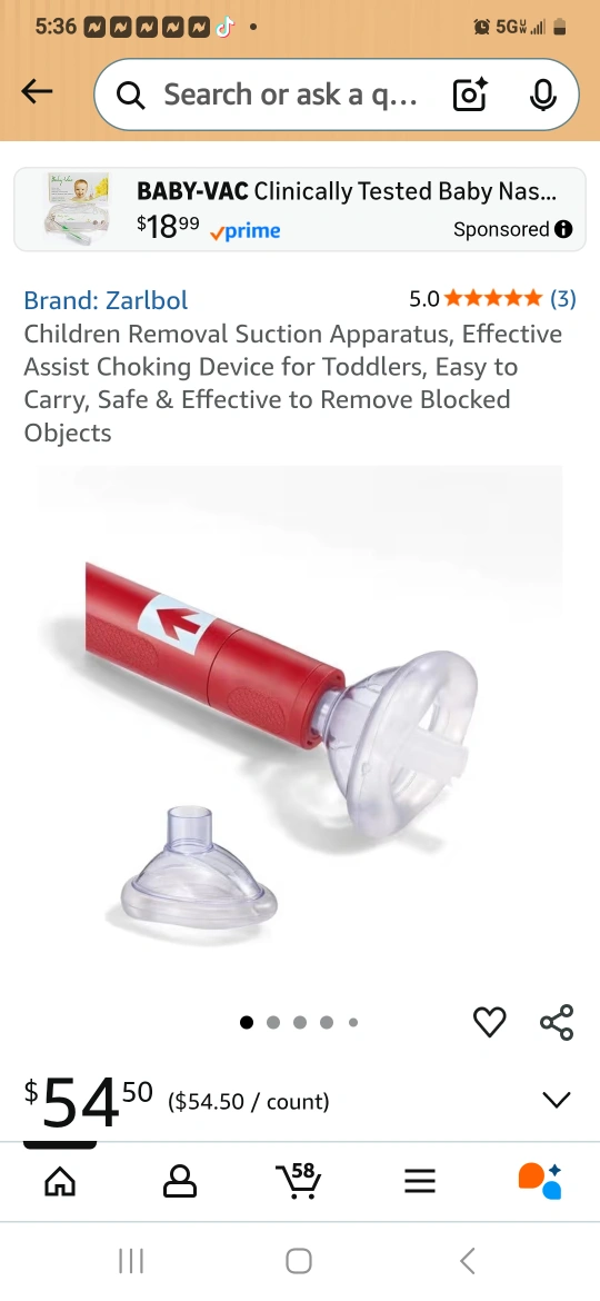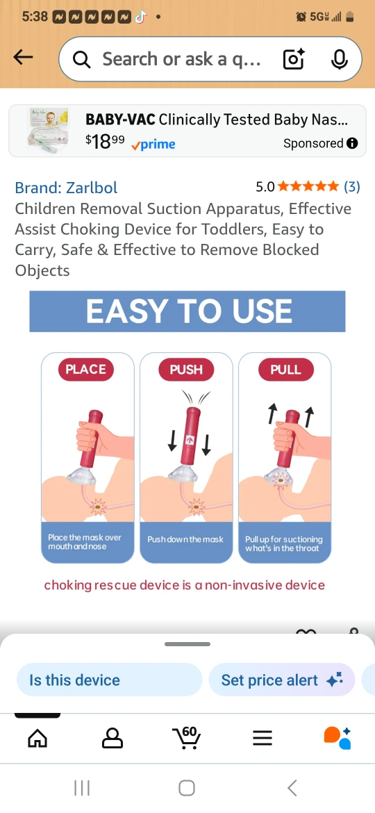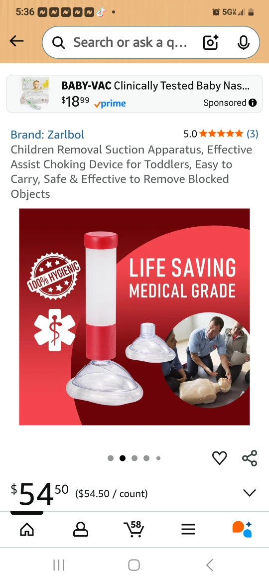 Selling a Zarlbol Baby-Vac Clinically Tested Baby Nasal/Choking Rescue Device for Toddlers. It's designed to assist with choking and remove blocked objects. It is easy to use and effective to clear clogs. One kit protects the entire family!