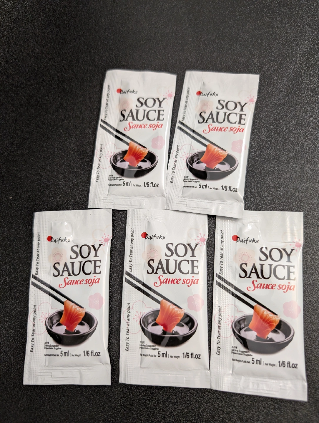 55Individual packets of Daifuku soy sauce are available. These are easy to tear at any point and contain 5ml (1/6 fl.oz) of soy sauce per packet. Perfect for on-the-go use or adding to your meal!