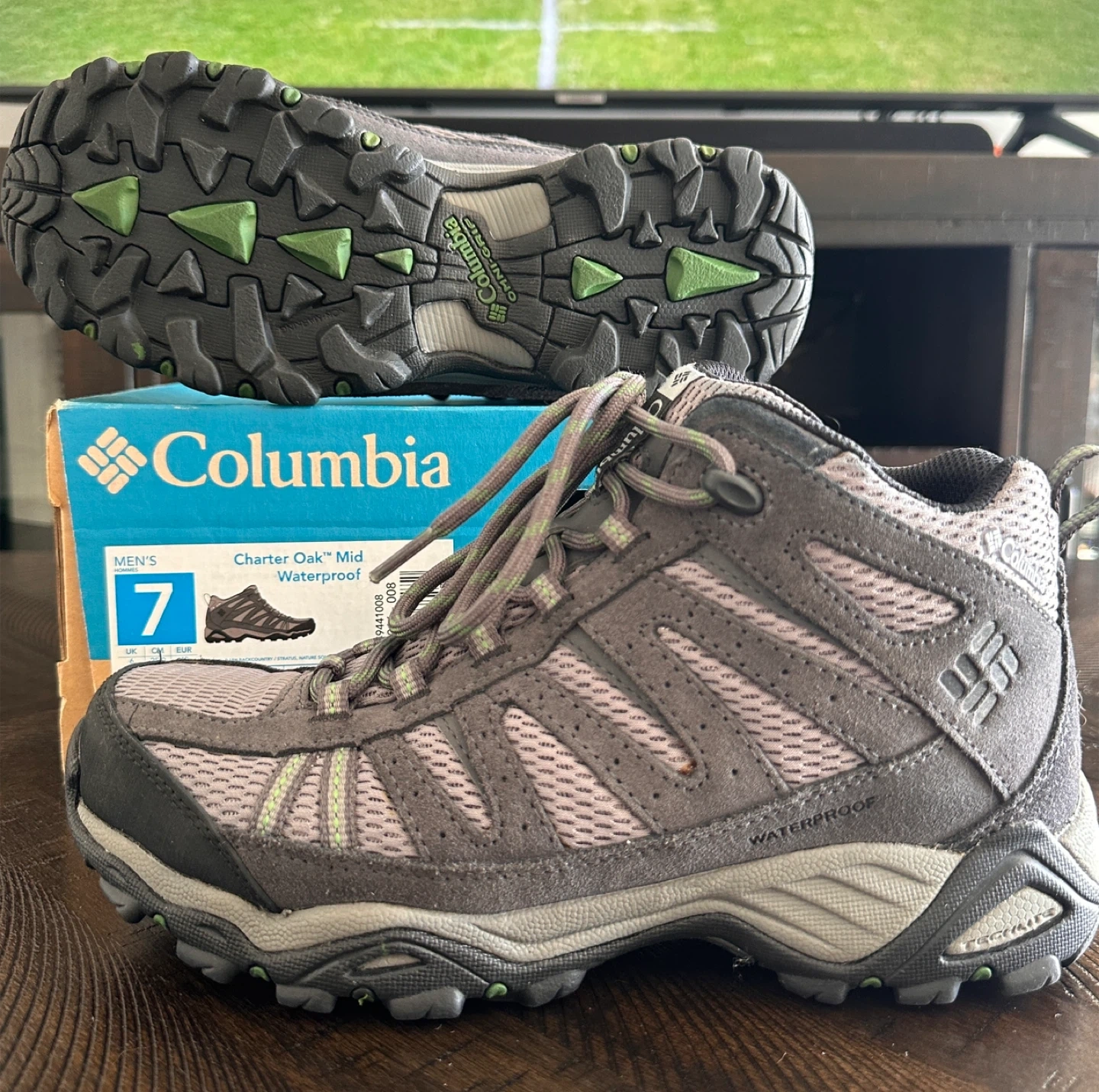 I'm selling a pair of Columbia Charter Oak Mid Waterproof hiking boots in men's size 7. They are in great condition and ready for your next adventure! They are waterproof and come in the original box