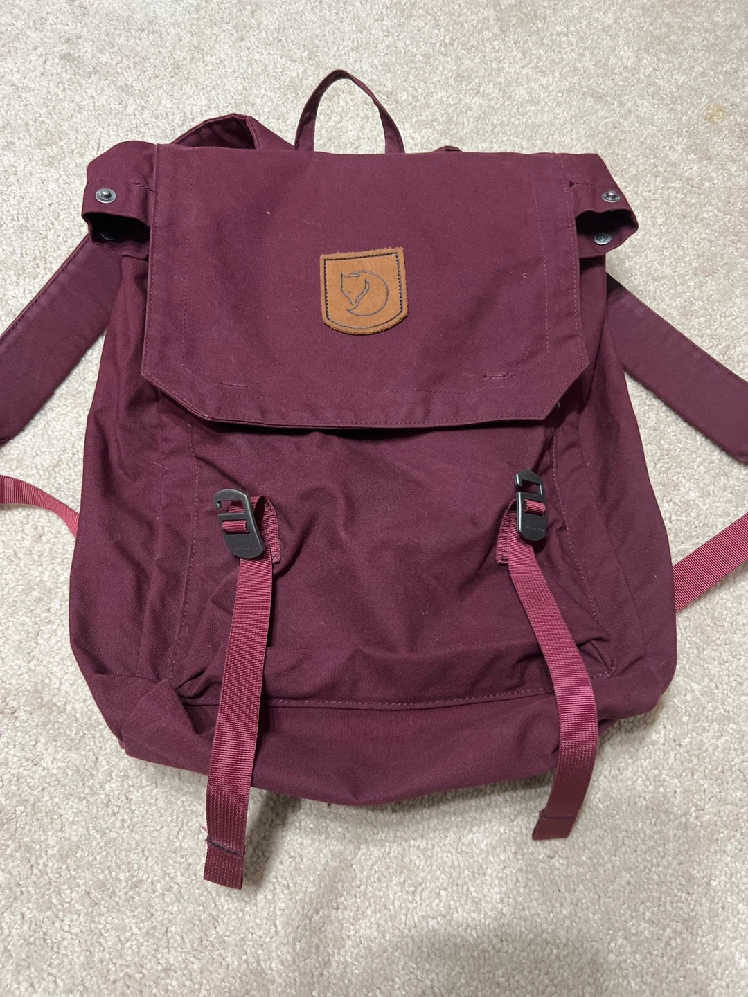 Selling a Fjallraven Foldsack No. 1 backpack in burgundy! This stylish and durable backpack is perfect for everyday use or outdoor adventures. It features a spacious main compartment and a convenient front pocket for easy access to your essentials. The material is sturdy and built to last. It's in great shape and ready for a new home!