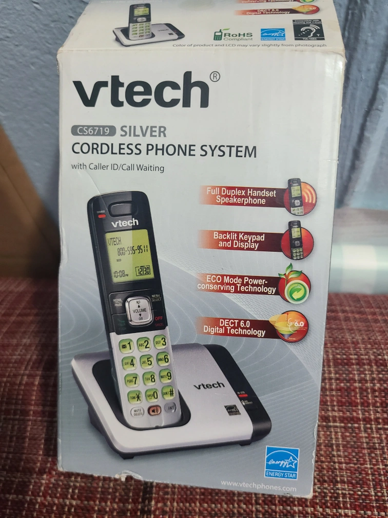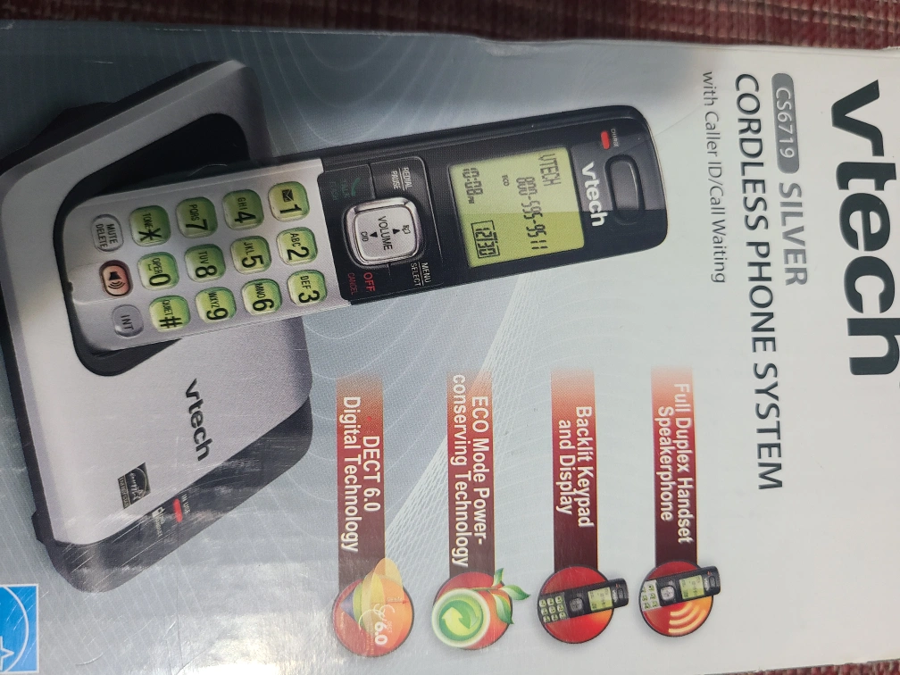 161Selling a VTech CS6719 silver cordless phone system. It comes with caller ID and call waiting. The box is included and features: - Full Duplex Handset Speakerphone - Backlit Keypad and Display - ECO Mode Power-conserving Technology - DECT 6.0 Digital Technology Free with any purchase of $8. or more.