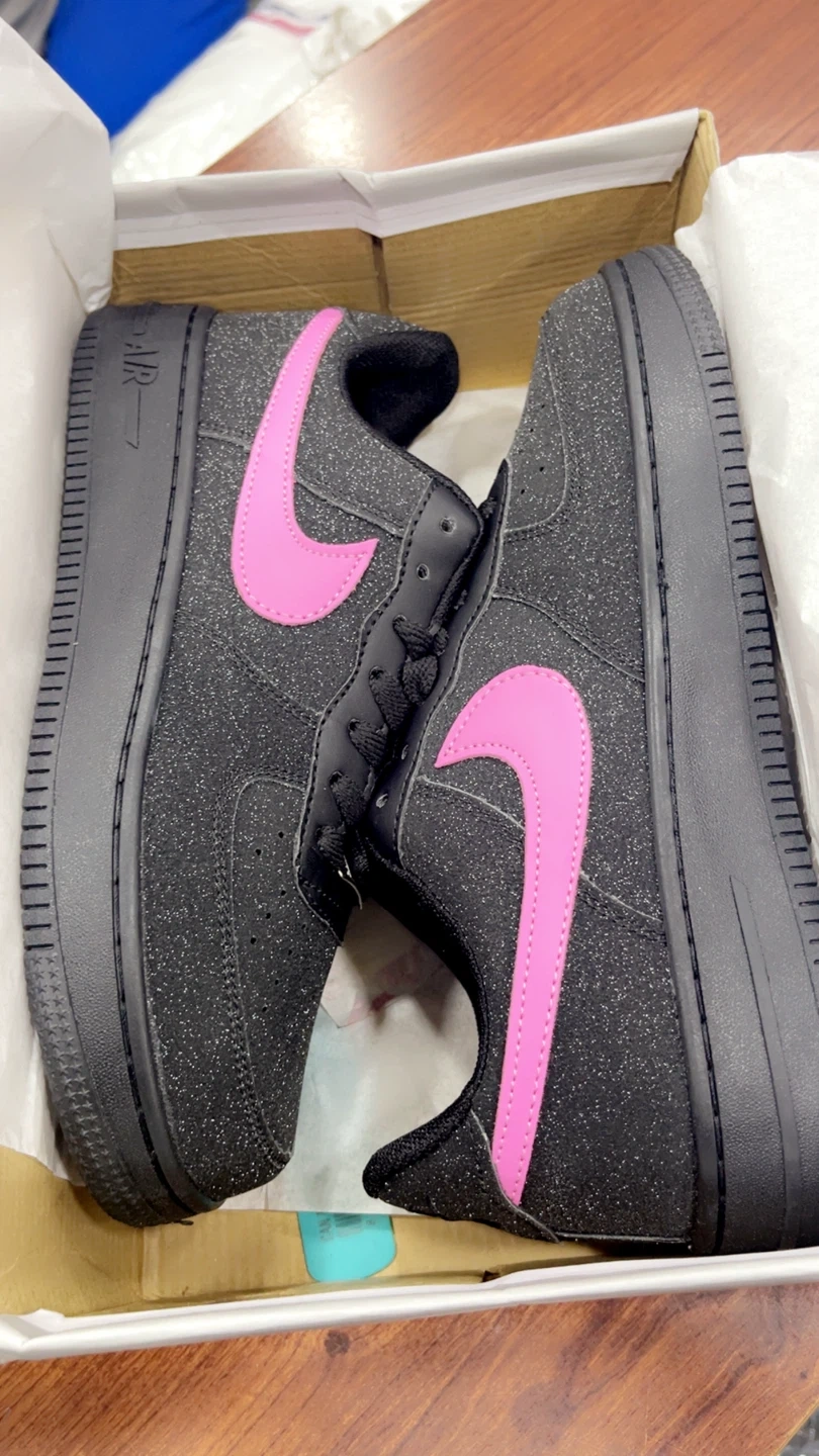 Selling a pair of Nike Air Force 1s in black with a pink swoosh. They come with the original box in size 9.5 www.royalmantle.shop