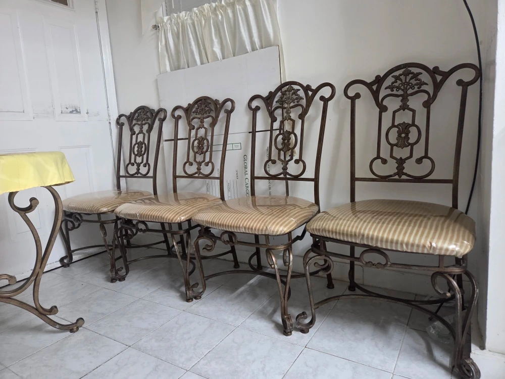 Selling a set of 4 ornate metal dining chairs! They have a unique, decorative design and sturdy metal construction. The seat cushions have a striped pattern. Perfect for adding a touch of elegance to your dining space.