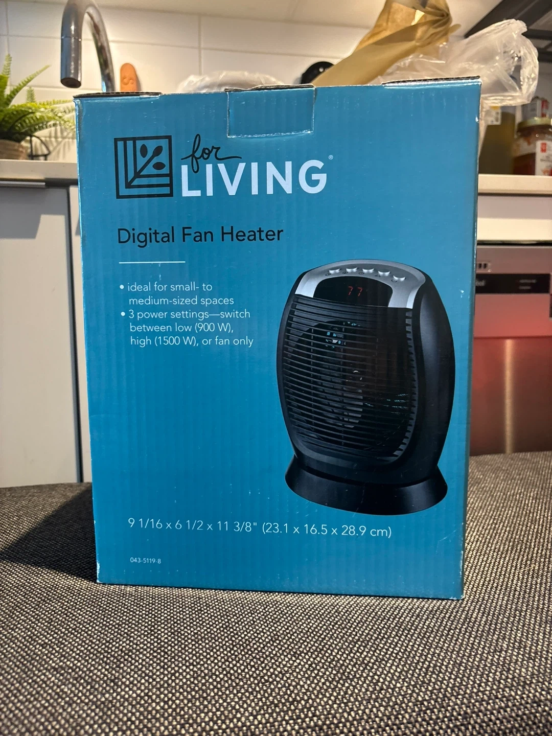 16Selling a Digital Fan Heater! It's ideal for small to medium-sized spaces. It has 3 power settings - switch between low (900 W), high (1500 W), or fan only. It also features an adjustable digital thermostat to select and maintain your desired temperature, and a 12-hour timer to program when you want the heater to turn off. The dimensions are 9 1/16 x 6 1/2 x 11 3/8" (23.1 x 16.5 x 28.9 cm).