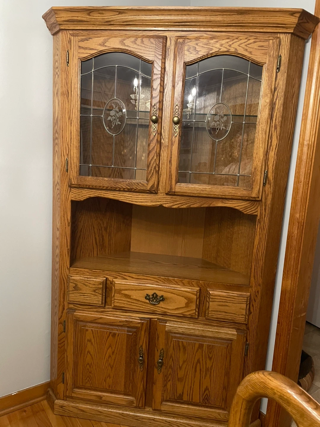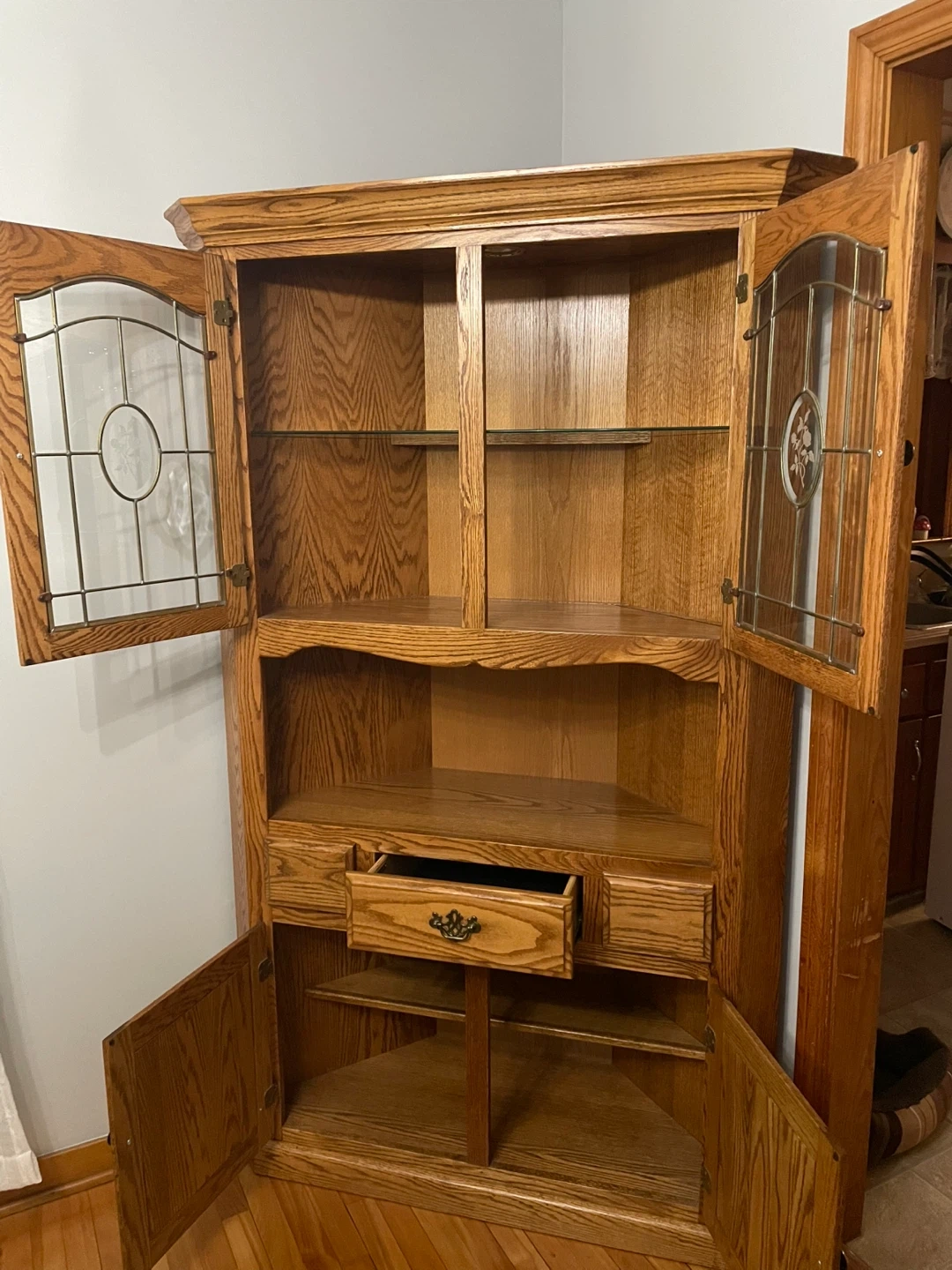 Selling a beautiful wooden corner china cabinet! It has glass doors on the top section and wooden doors on the bottom, with a drawer in the middle. Perfect for displaying your favorite items or storing dishes. $200 OBO