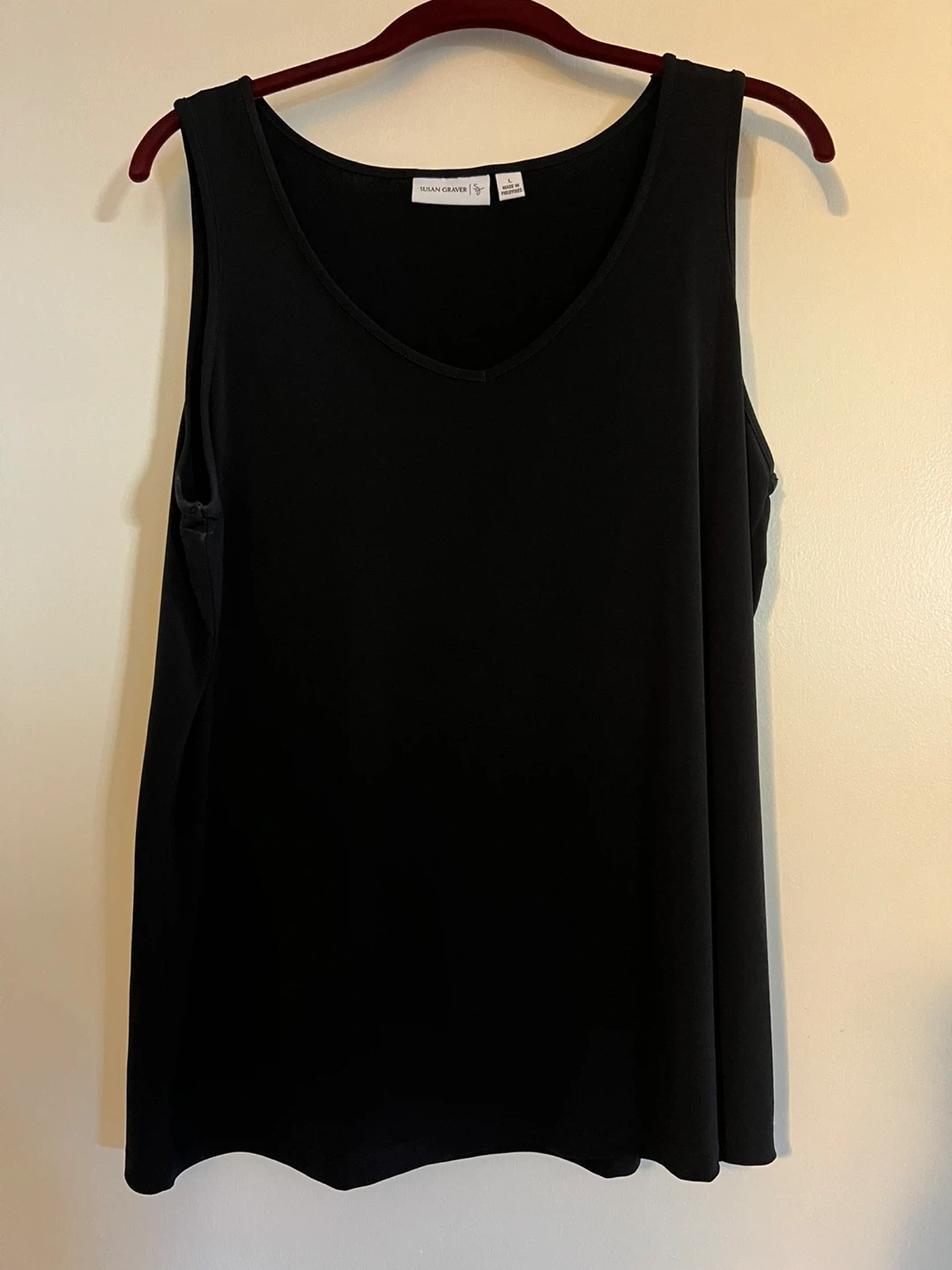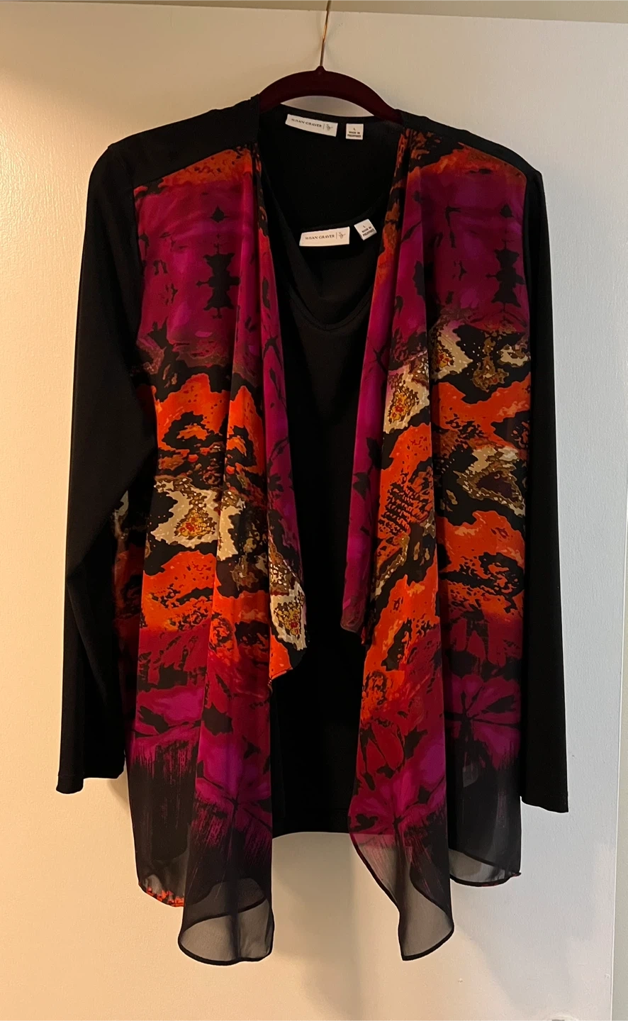 257I have a Susan Graver top and cardigan set for sale! It's a size large. The top is black and the cardigan has a beautiful pattern with shades of burgundy, orange, brown & black.