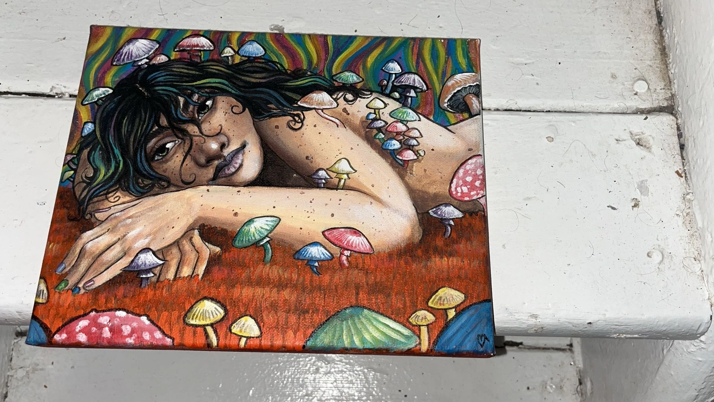 108” x 10” painting on canvas Naked person lying in a field of mushrooms
