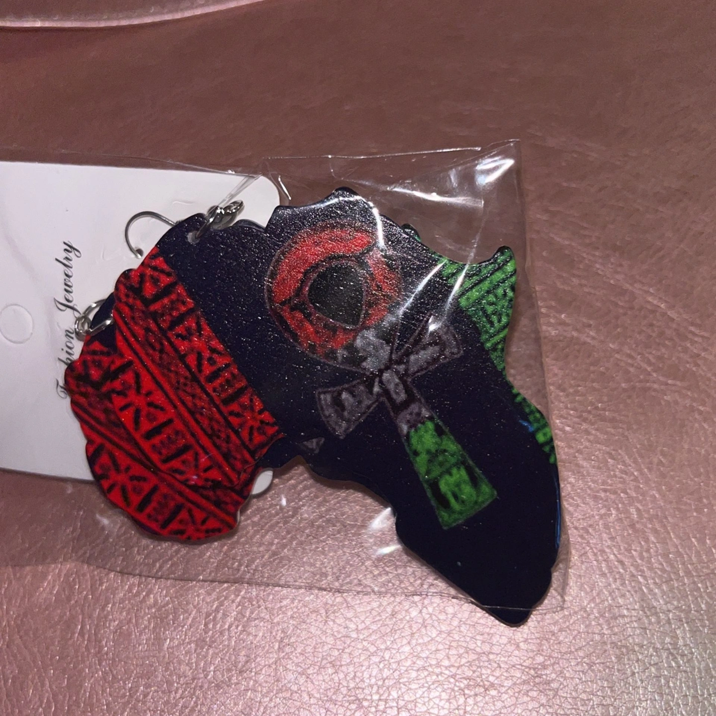 Wooden earrings in the shape of Africa, with red green and black coloring and an ankh in the center