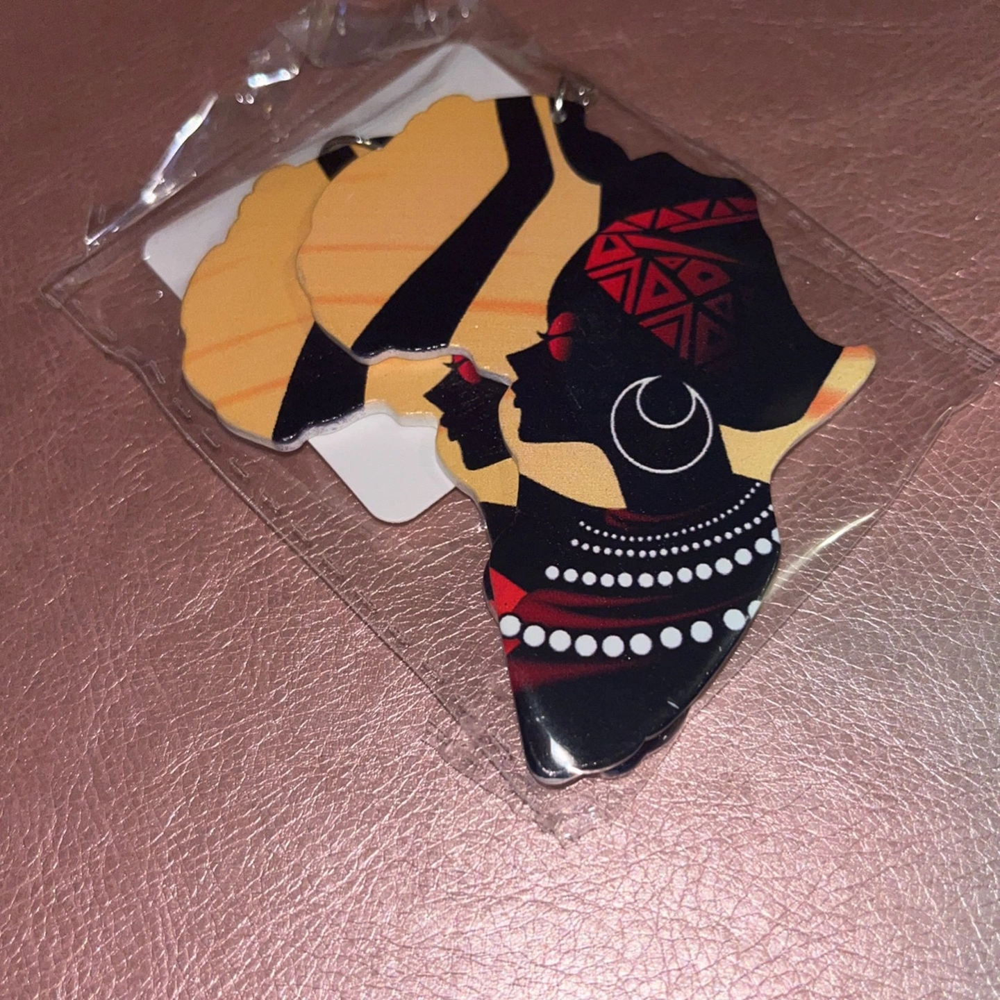985 pairs available $5 for each pair Lightweight Black woman with red eyeshadow, red headwrap/ turban, big hoop earrings, and bib necklace seen silhouetted against African continent Africa African American Black American Afro Black Queen Melanin Black Queen