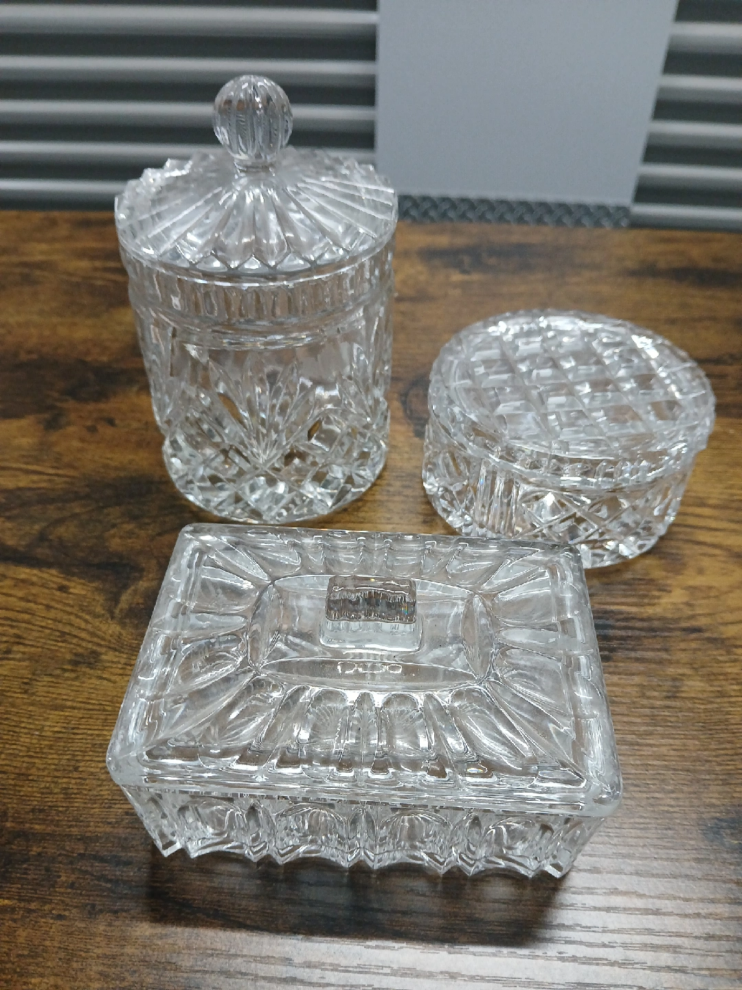 84Selling a beautiful set of three crystal glass trinket dishes! They have a lovely cut glass pattern and would be perfect for storing jewelry or other small items on your dresser or vanity. The set includes a jar with a lid, a round dish with a lid, and a rectangular dish with a lid. They are in great condition and ready for a new home
