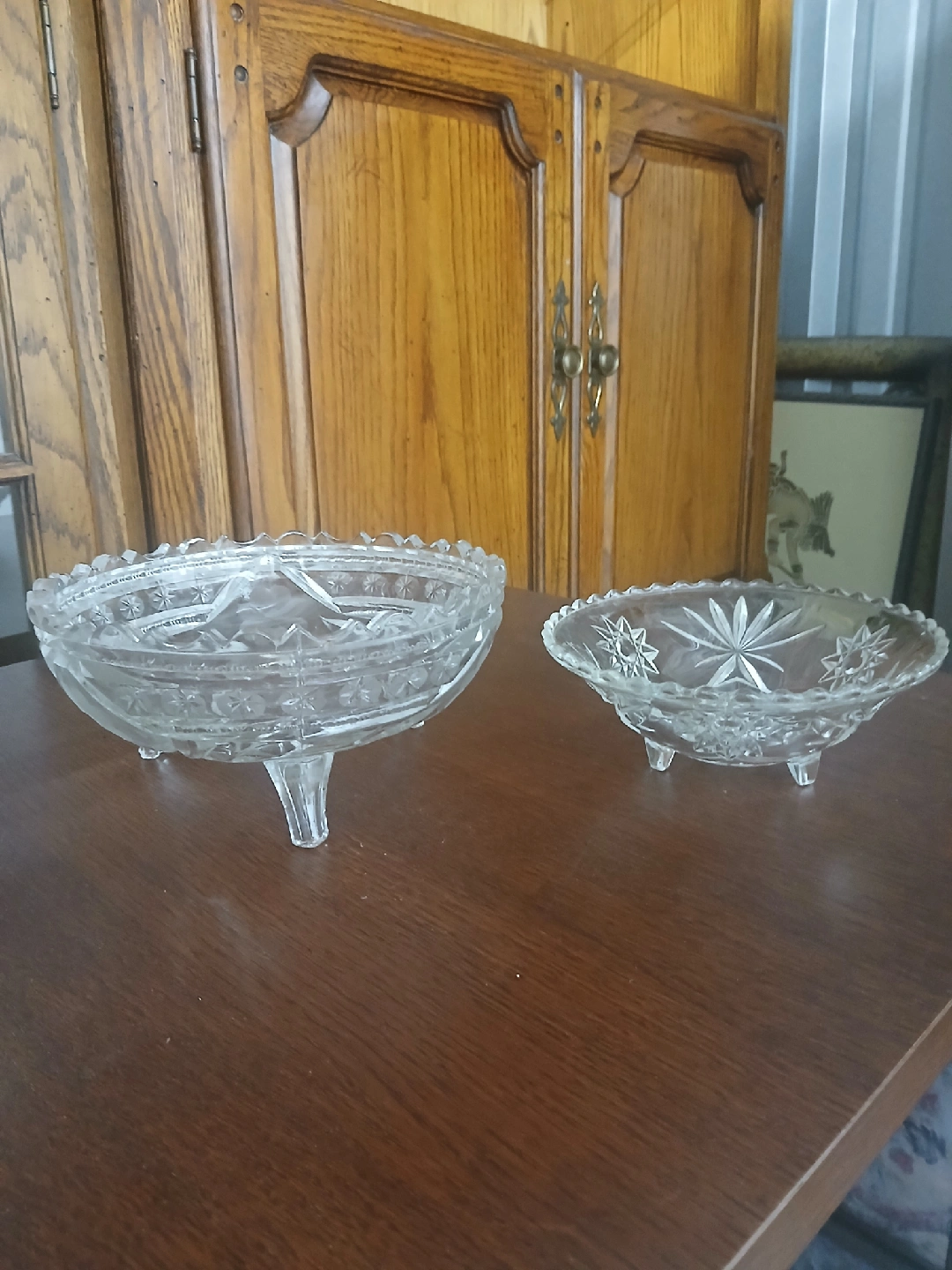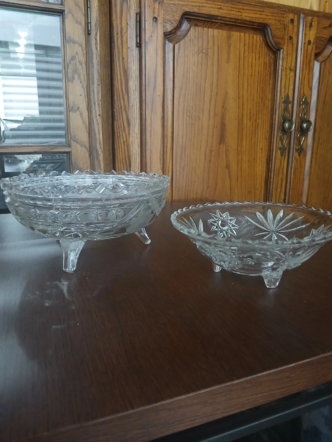 88Selling a set of two vintage clear glass footed bowls. They have a beautiful, intricate design. Perfect for adding a touch of elegance to your home decor!