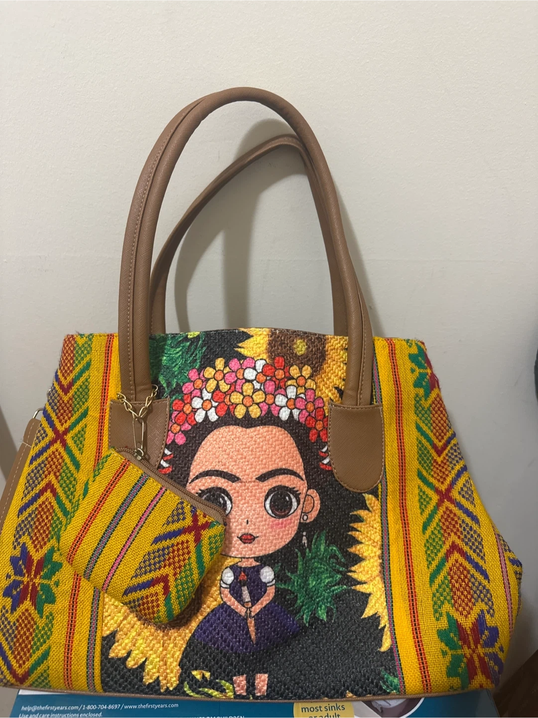60This is a fun Frida Kahlo tote bag with a matching coin purse! It's in great condition and ready for a new home. The bag features a colorful design with brown handles.