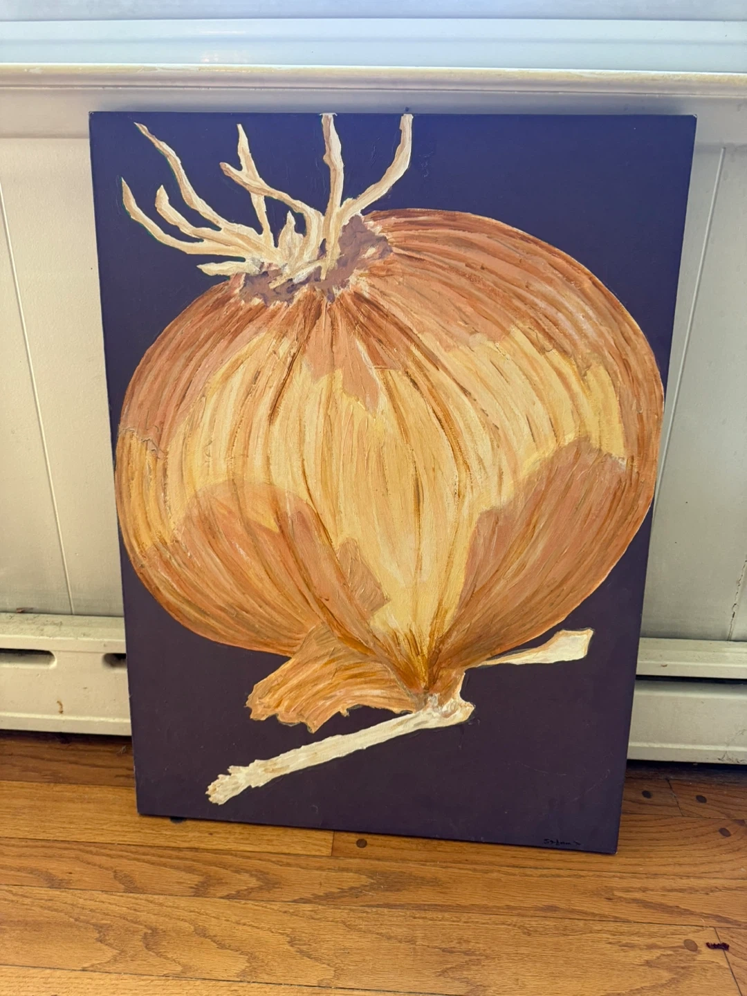 78This is a painting of an onion on a dark blue background. It's a unique piece of art!