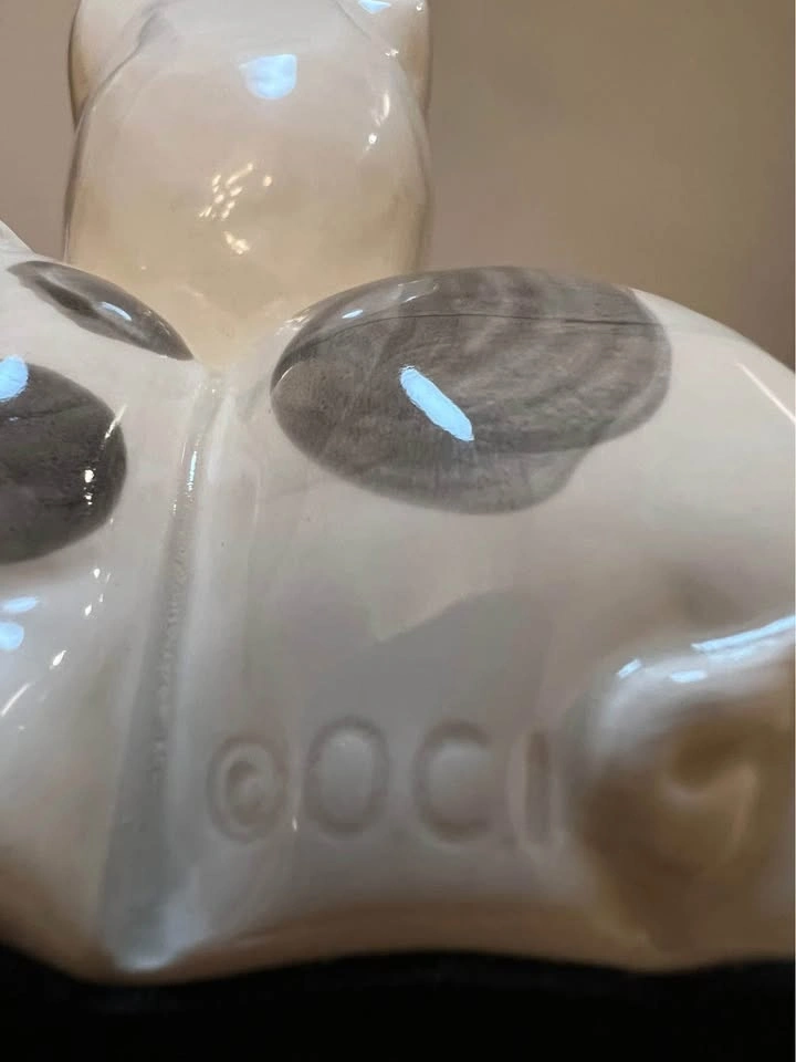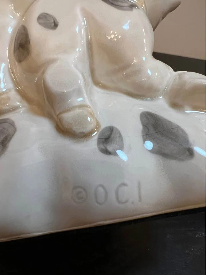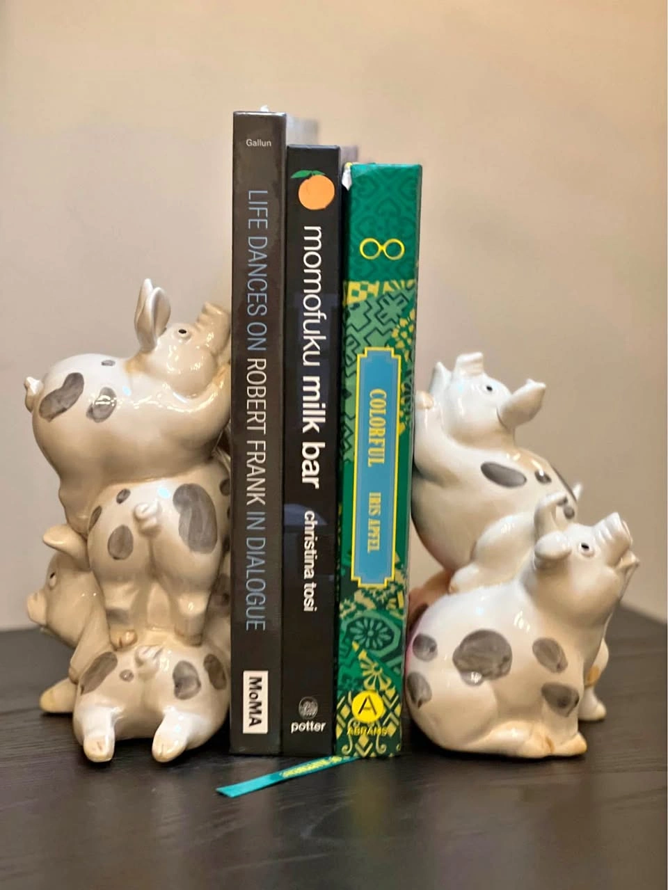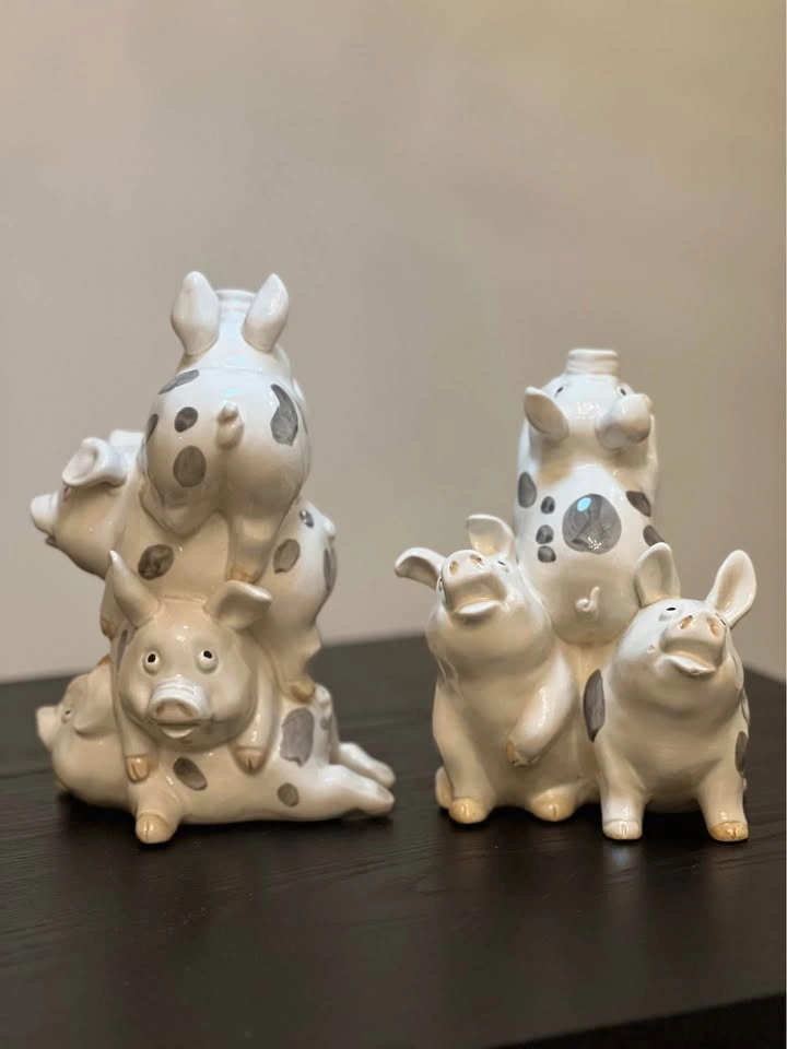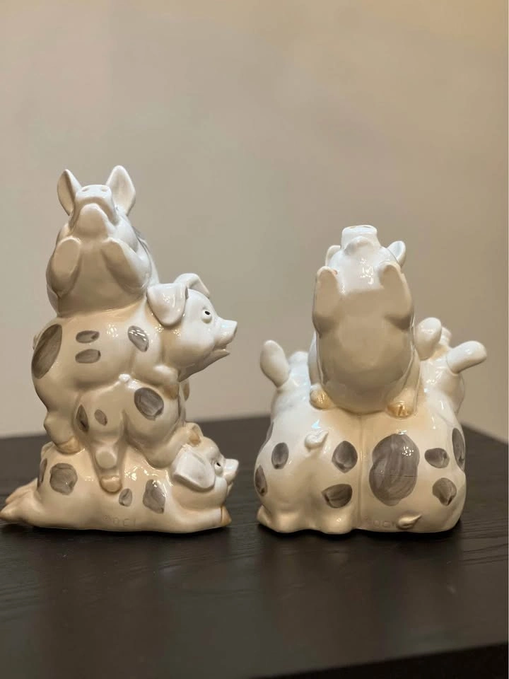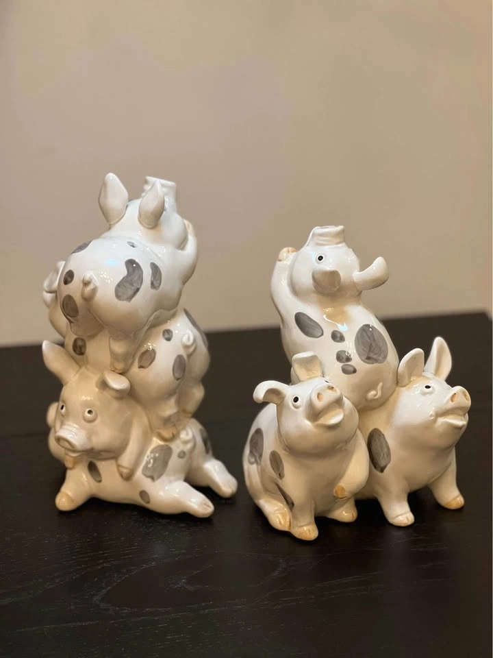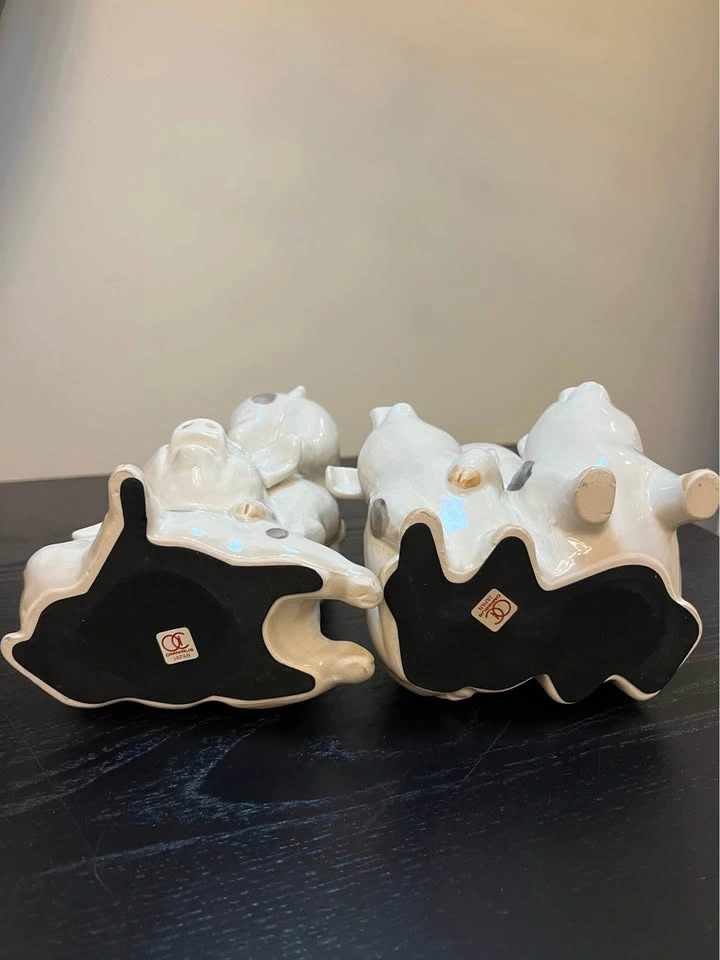 98Vintage Fitz and Floyd Omnibus OCI bookends. Made in Japan. Whimsical stacked pile of spotted pigs. Perfect gift for your favorite pig collector. Black and white ceramic porcelain. Felt bottoms with original labels. Taller piece with 4 pigs in the pile: 8” high by 5” wide. Shorter piece with 3 pigs in the pile: 7” high by 4.5” wide.