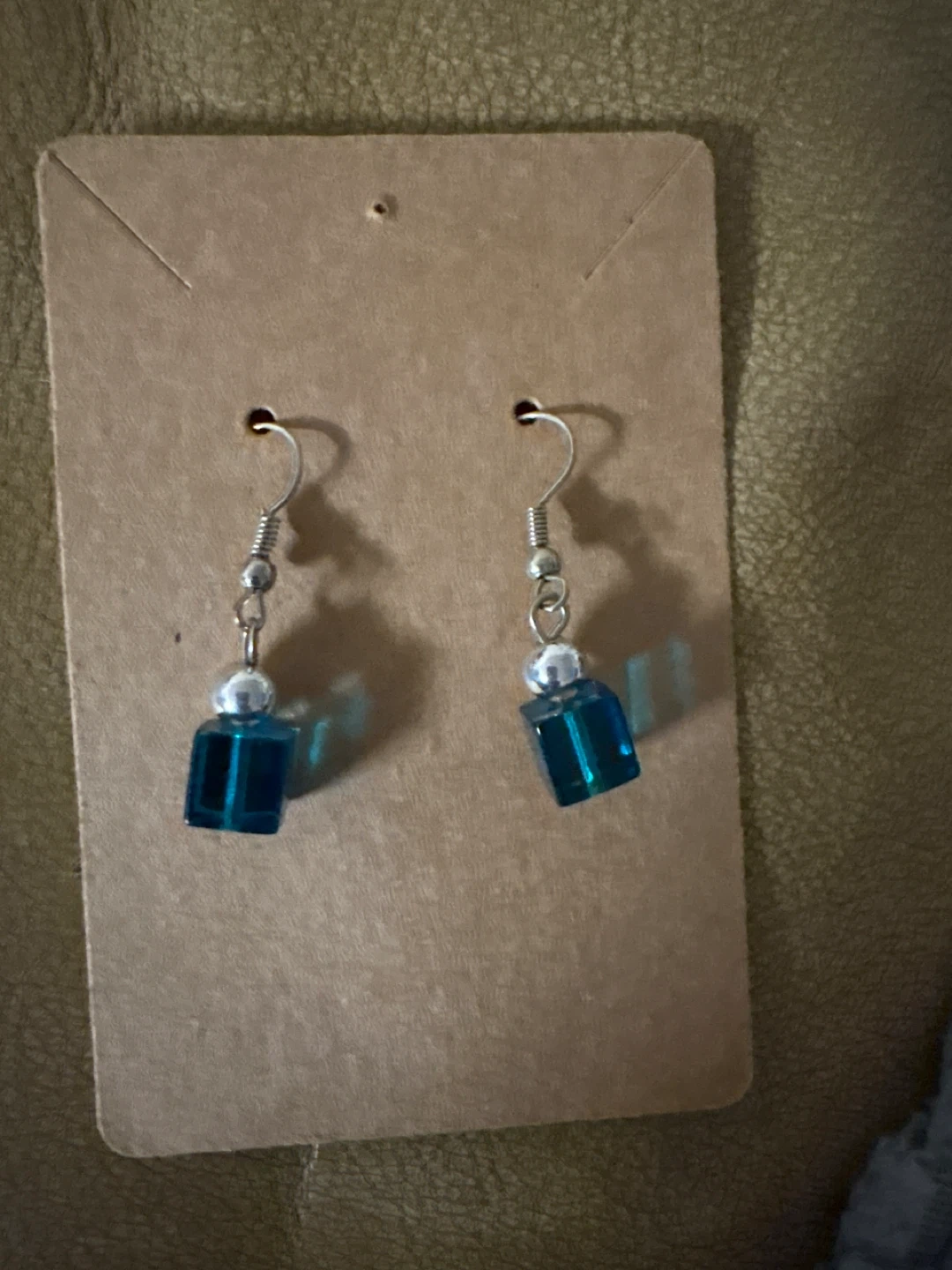 209Cute pair of dangle earrings with a blue cube bead and silver accents. They are in good condition and ready to wear!