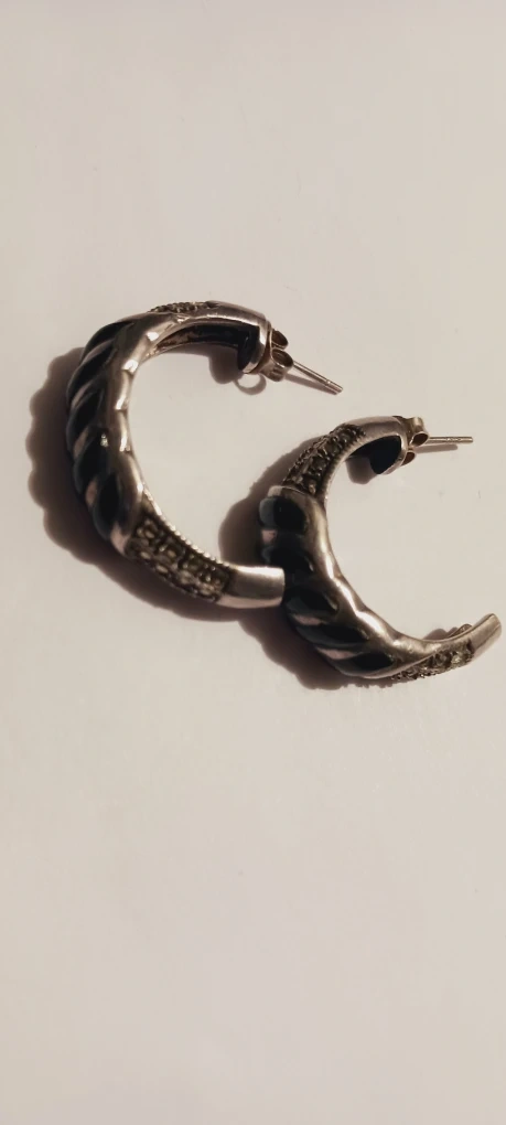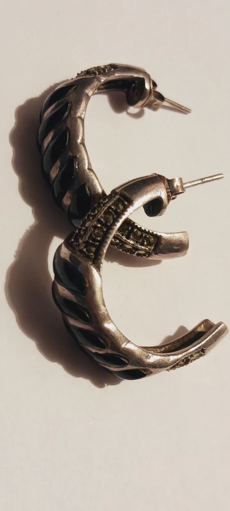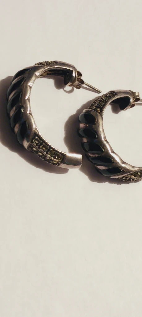 1000+These are a pair of sterling silver 925 Marcasite Onyx hoop earrings. They have a twisted design with some small stones embedded in them. They're perfect for adding a touch of elegance to any outfit! 1.3" diameter. Excellent condition. ALL MY PRICES ARE NEGOTIABLE !!!