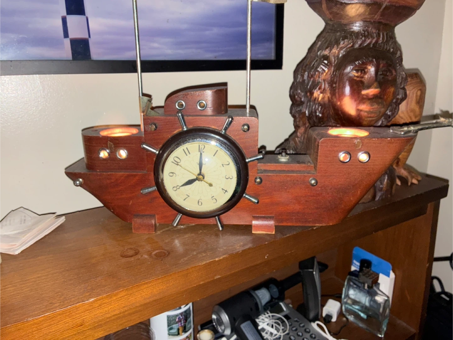 10Selling a unique wooden ship clock! It's a charming decorative piece with a nautical theme. The clock face is integrated into the ship's wheel, adding to its character