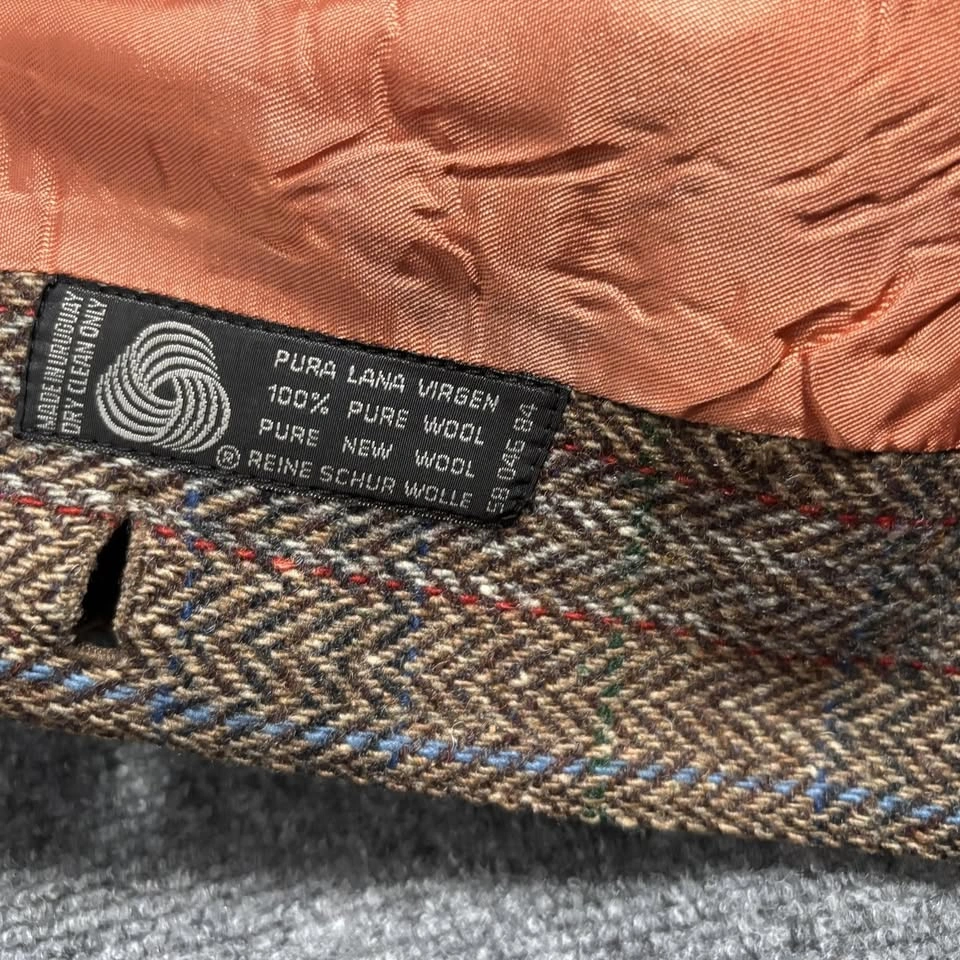 Classic brown herringbone tweed with subtle multicolor vertical stripes for timeless style. Shell: 100% pure new wool (lambswool) for warmth and durability. Lining: 100% acetate in a rich rust orange color. Traditional single-breasted blazer with notched lapels and two front flap pockets. Distinctive mid-century Oscar de la Renta label and era-appropriate size 13/14. Made in Uruguay; dry clean only per care label. Perfect for fall or winter, modern preppy, business classic, or vintage outfit. All brand and content labels present inside lining. Great womens vintage business, academia, or casual statement piece.