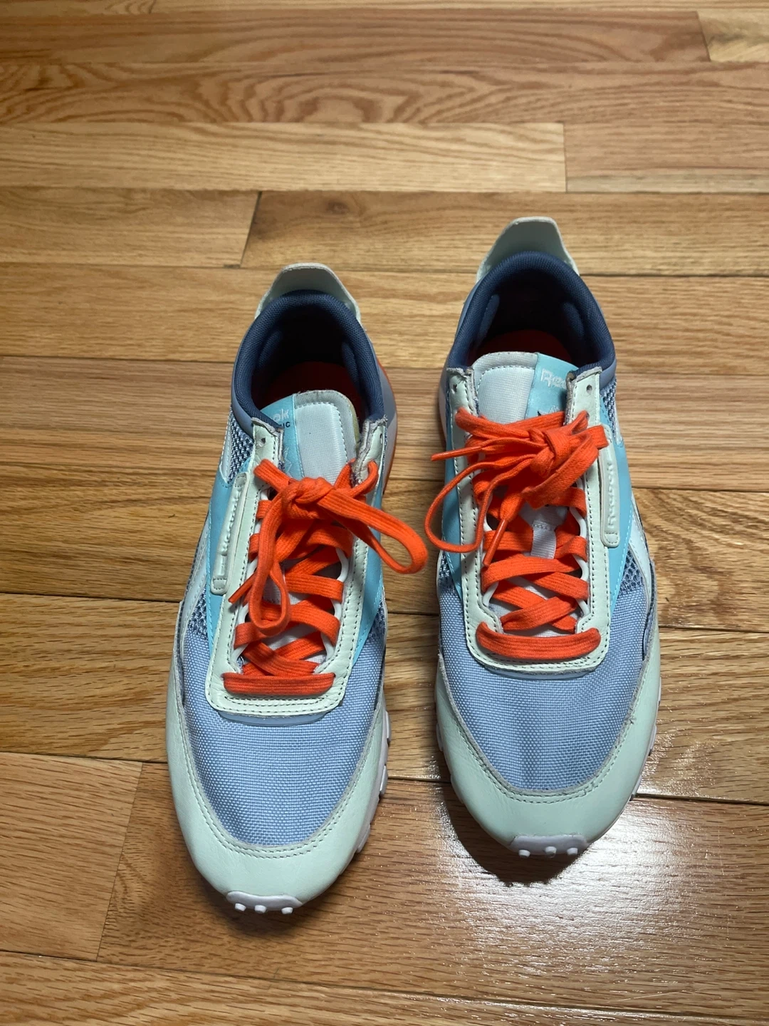 These Reebok Classic Legacy AZ shoes are in great condition and ready for a new home! The shoes feature a stylish design with a mix of blue, white, and orange accents. They are perfect for adding a pop of color to your casual outfits and are super comfortable for everyday wear