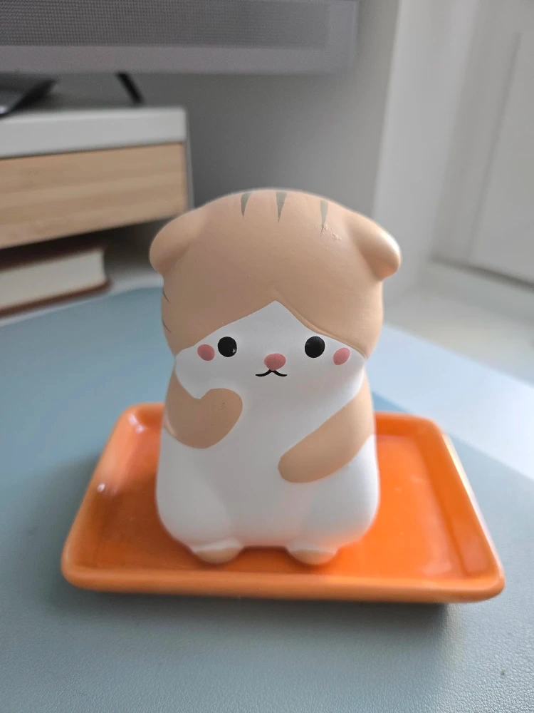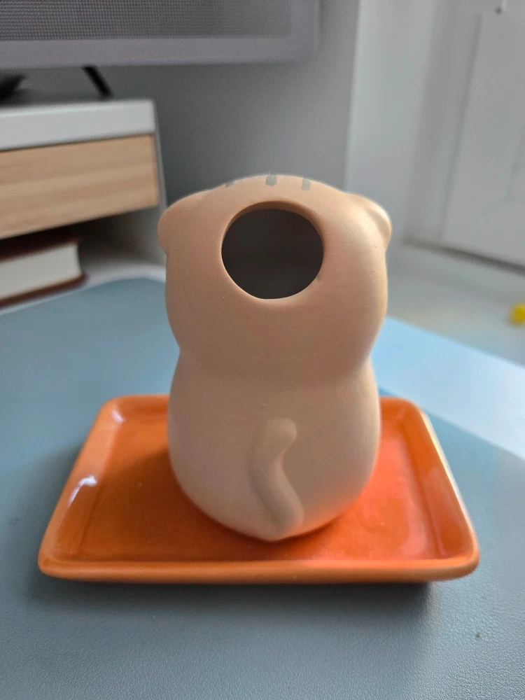 70This is a cute cat-shaped ceramic vase holder with a small tray. It's perfect for adding a touch of whimsy to your bathroom or vanity area! It's in like new condition.